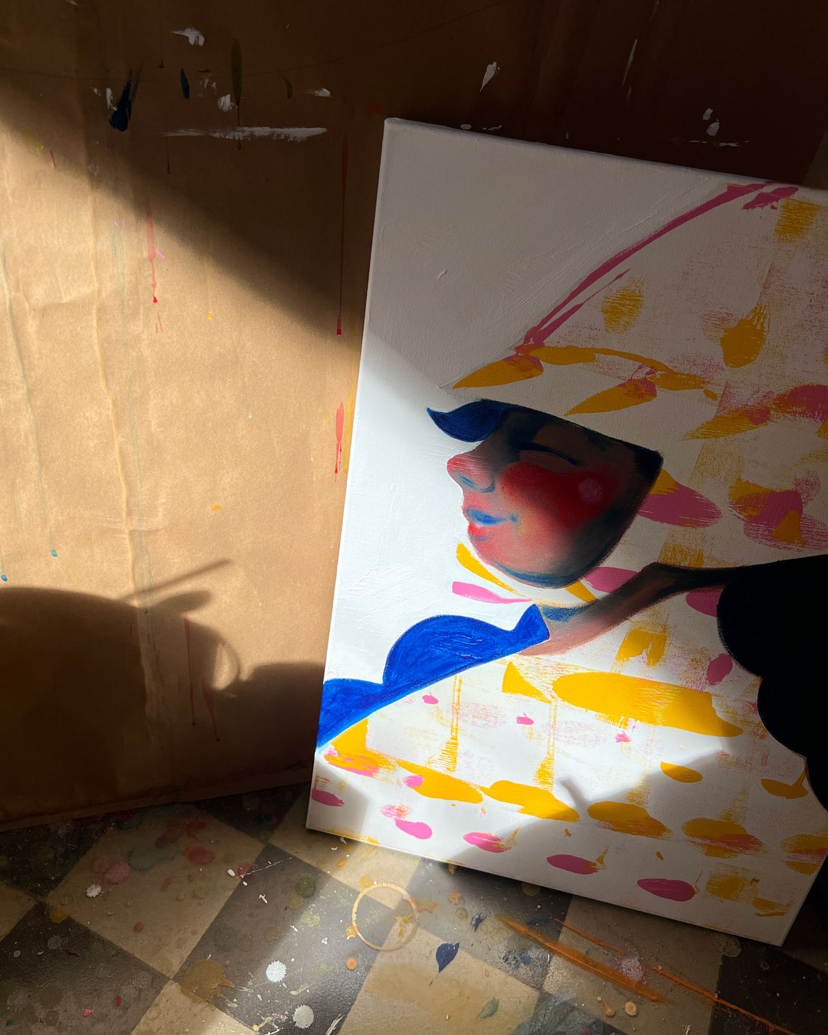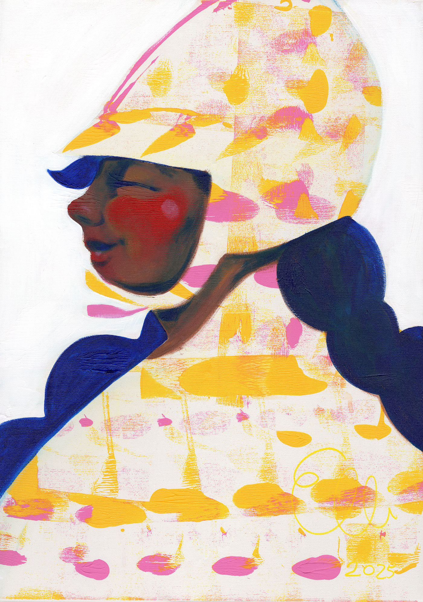 Elli Maanpää: Letit ja lippa, 2025, 50 × 70 cm, akryylimaalaus kankaalle.