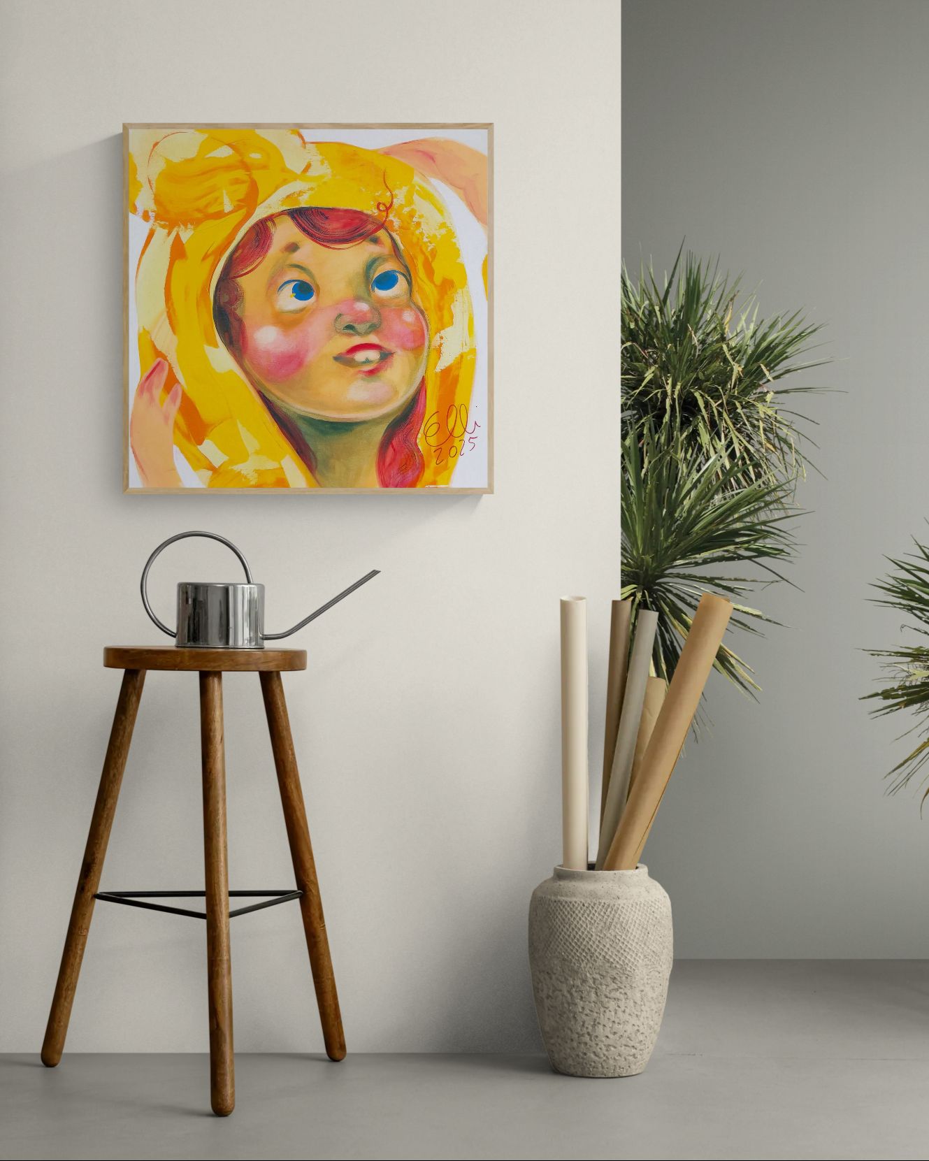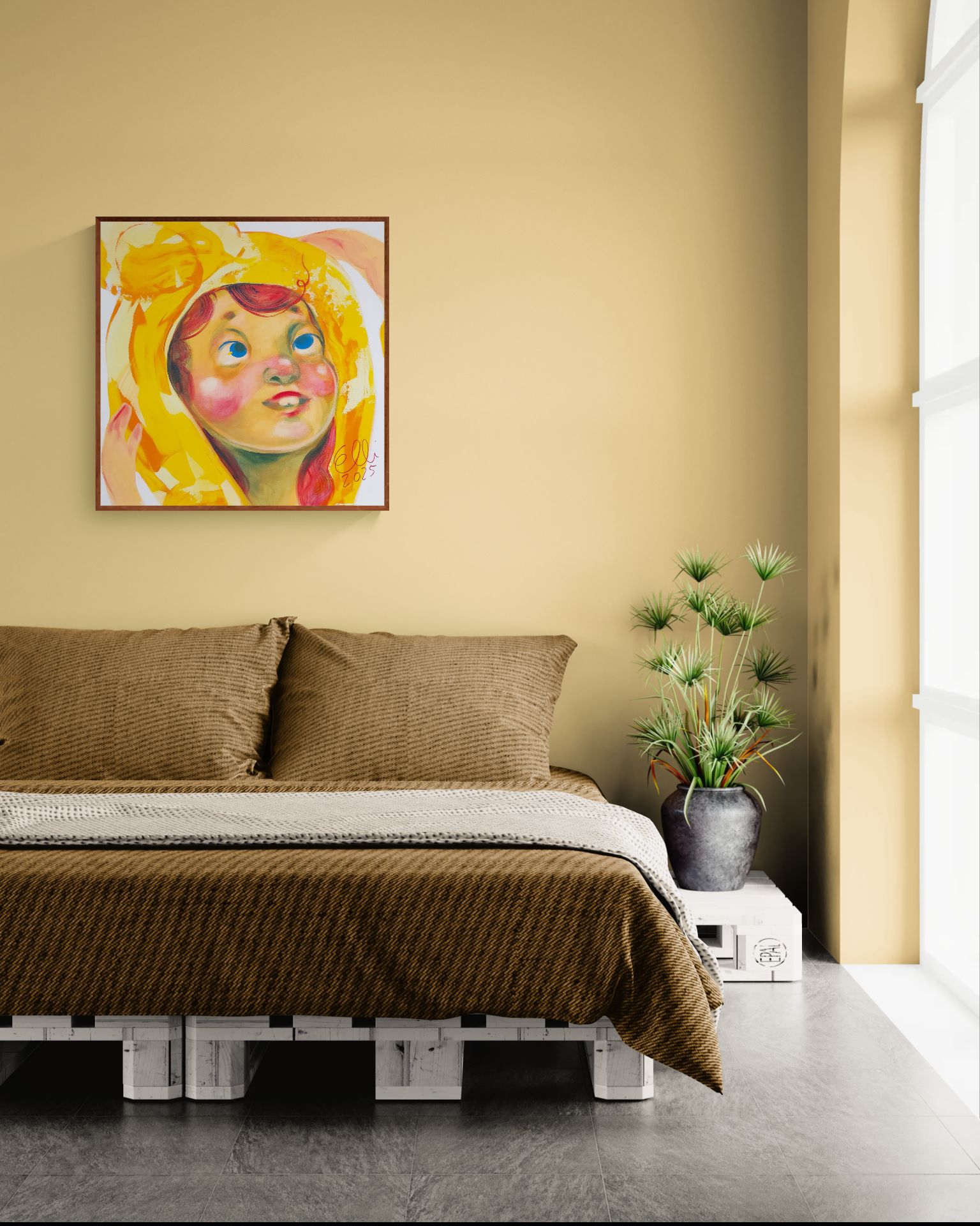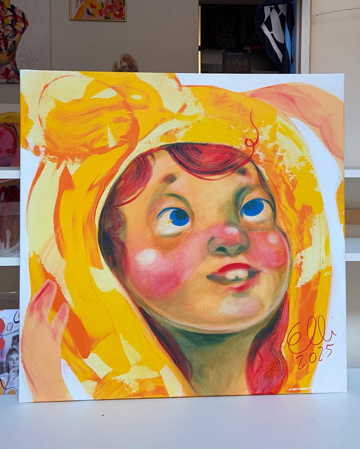 “Lämmön lupaus (keltainen pipo)” (70 x 70 cm) maalaus on kuin lämmin hymy.