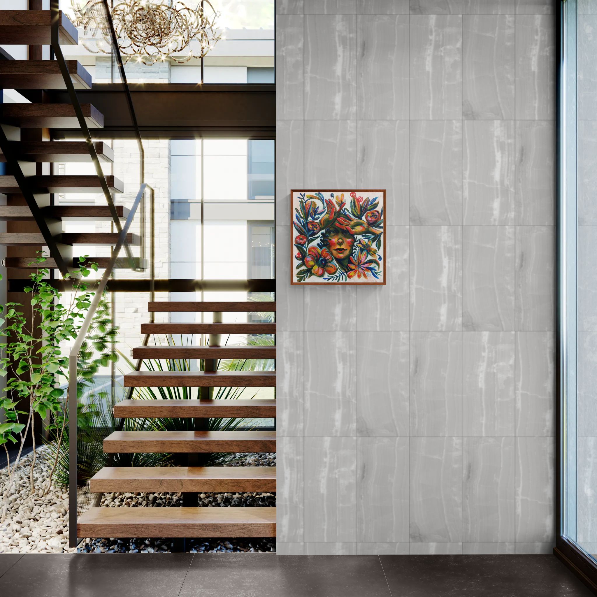 “Siimes” (50x50 cm) on akryylimaalaus naisesta kukoistavan kasvillisuuden siimeksessä.