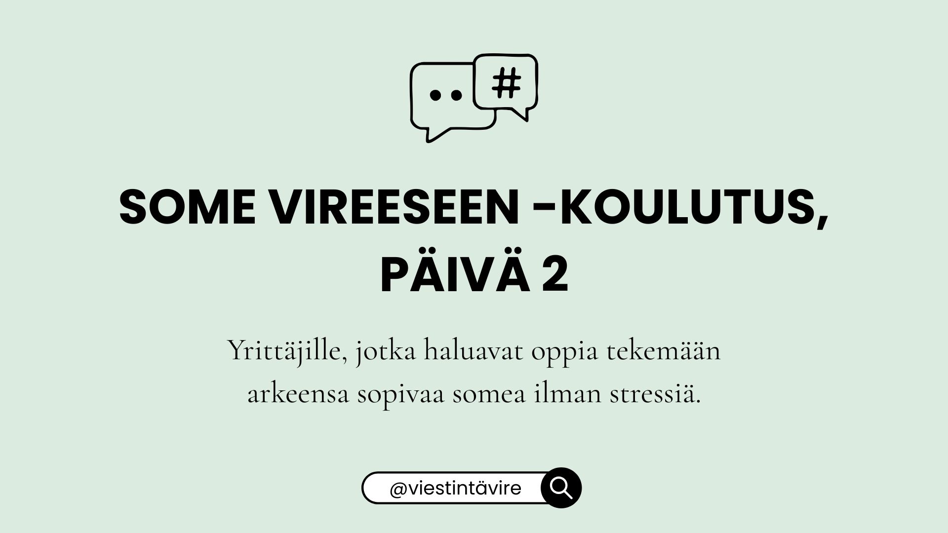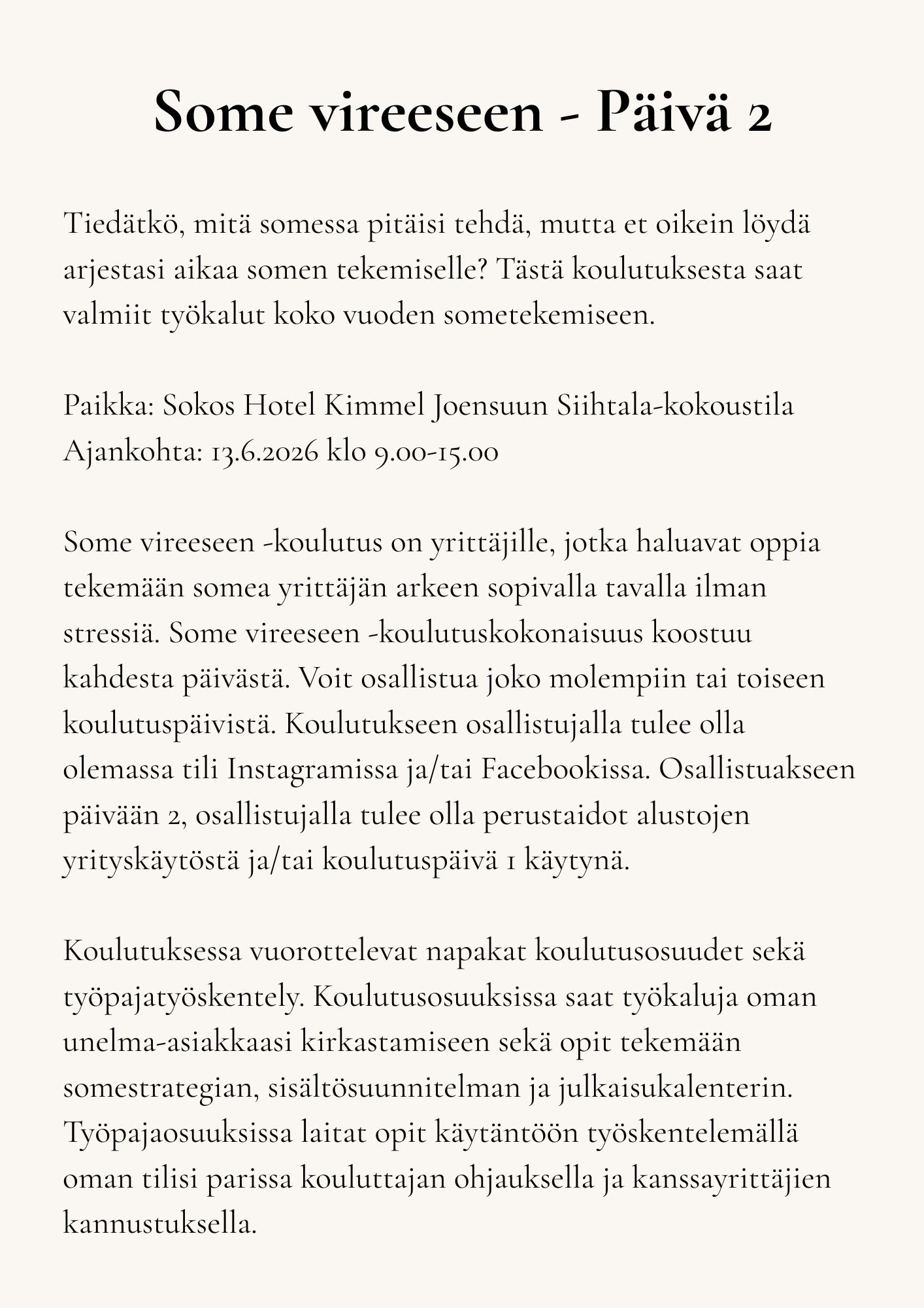Some vireeseen -koulutus on yrittäjille, jotka haluavat oppia tekemään somea yrittäjän arkeen sopivalla tavalla ilman stressiä. Some vireeseen -koulutuskokonaisuus koostuu kahdesta päivästä. Voit osallistua joko molempiin tai toiseen koulutuspäivistä. Koulutukseen osallistujalla tulee olla olemassa tili Instagramissa ja/tai Facebookissa. Osallistuakseen päivään 2, osallistujalla tulee olla perustaidot alustojen yrityskäytöstä ja/tai koulutuspäivä 1 käytynä.