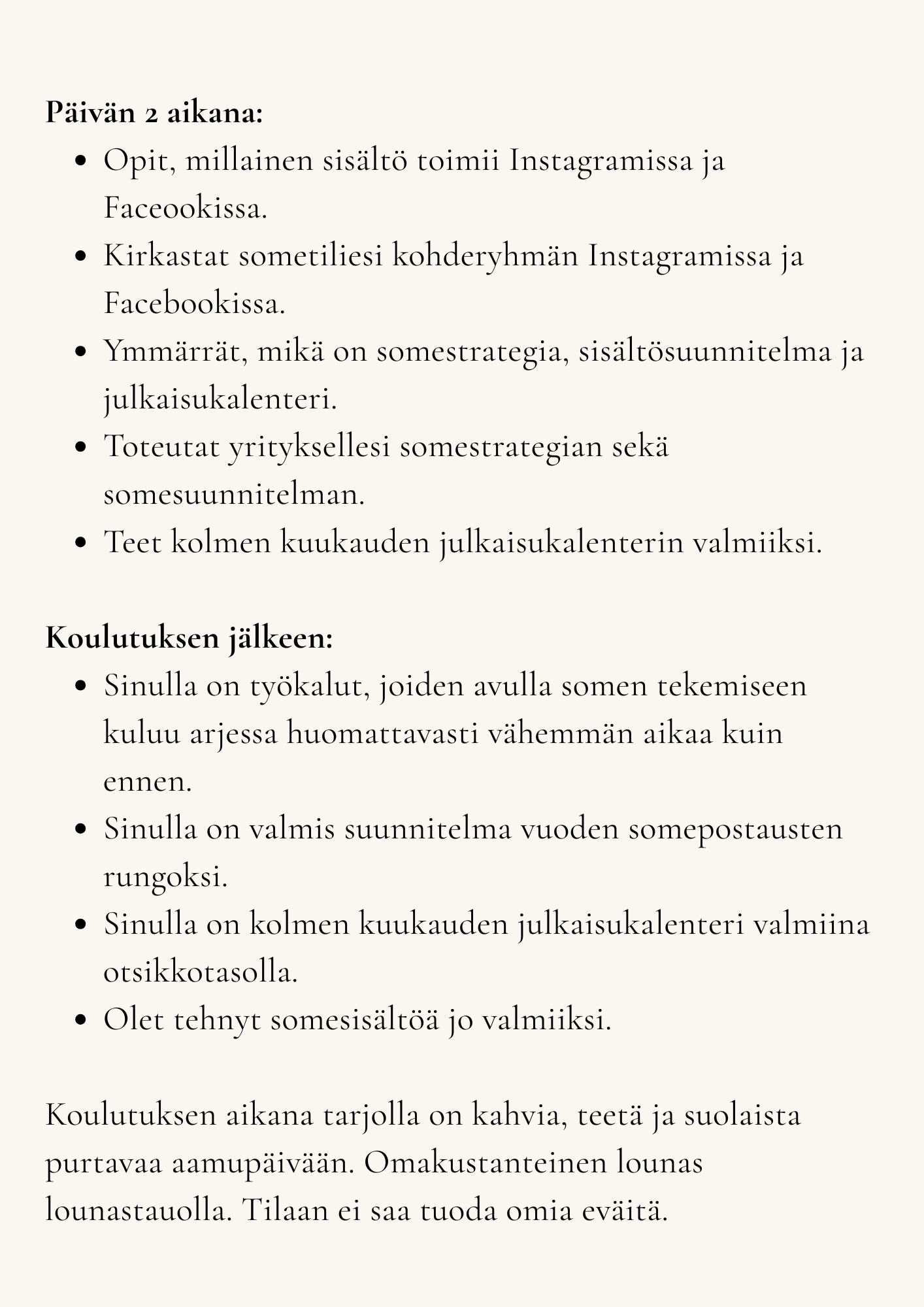 Päivän 2 aikana: Opit, millainen sisältö toimii Instagramissa ja Faceookissa. Kirkastat sometiliesi kohderyhmän Instagramissa ja Facebookissa. Ymmärrät, mikä on somestrategia, sisältösuunnitelma ja julkaisukalenteri. Toteutat yrityksellesi somestrategian sekä somesuunnitelman. Teet kolmen kuukauden julkaisukalenterin valmiiksi. Sinulla on mahdollisuus ottaa myös kuvia kanssayrittäjien kanssa yhdessä somekanaviisi.