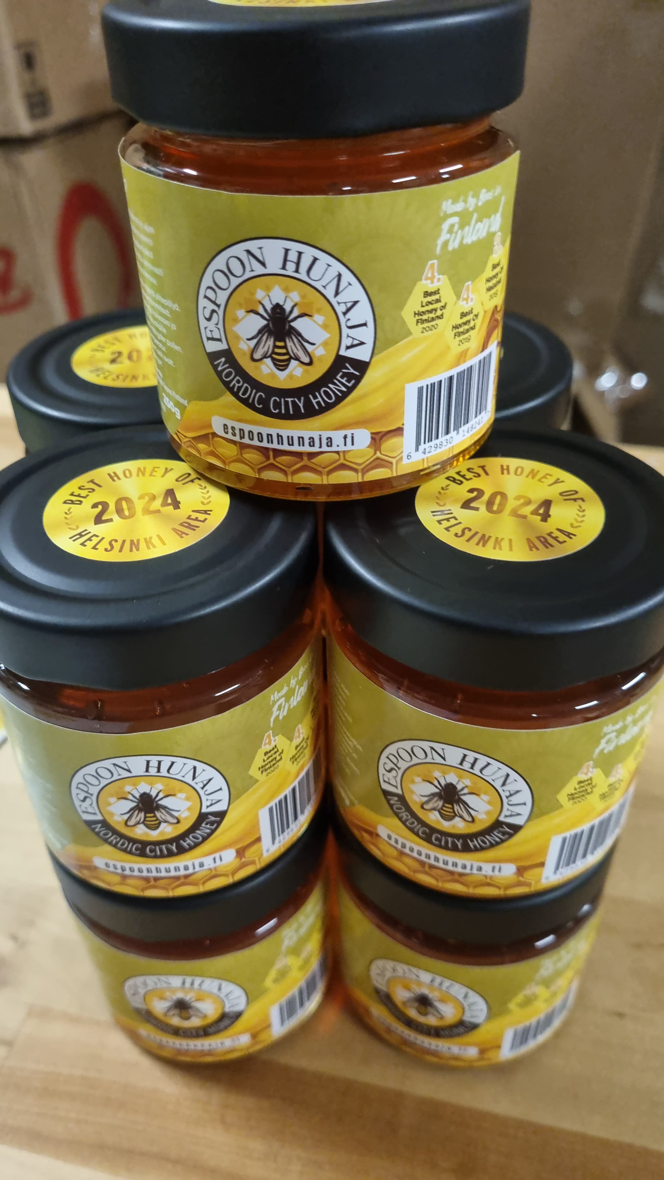 Suomen Paras Hunaja Kilpailun 3. sijaa ja Stadin Paras Hunaja kilpailun voittaja hunaja on nyt myynnissä 250g pakkauksiisa. ESPOON HUNAJA Nordic City Honey tarroilla. Blended City Honey Espoo&Helsinki