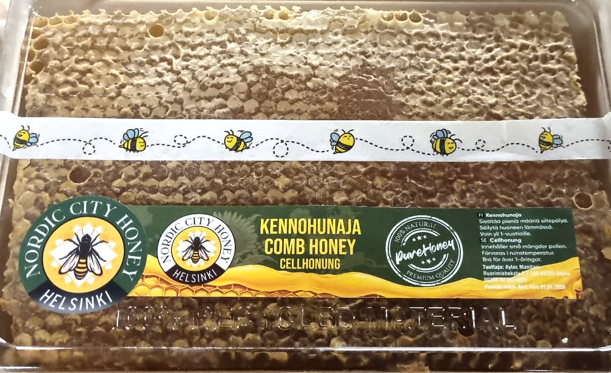 Suomalainen pohjukkellinen kennohunajaa. Tuotteen ulkonäkö tai pakkaus saattaa poiketa kuvasta. Sisältää pieniä määriä siitepölyä.