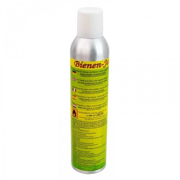 Kylmäsavuspray, jota voi käyttää nopeilla pesäkäynneillä savuttimen sijaan. Monet hoitajat pitääkin Bienen-Jetin kaltaisia tuotteita mukana juuri pikkuhommia varten, jolloin ei viitsi sytyttää savutinta.