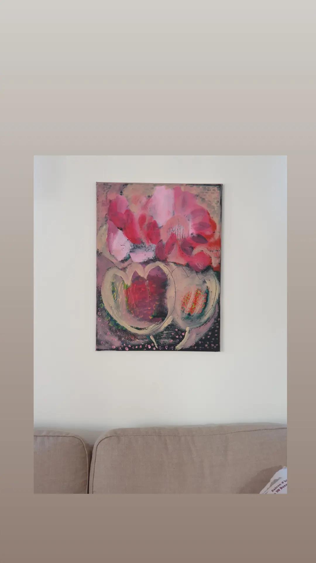Rouhea mutta pehmeä kukkien inspiroima akryylimaalaus.