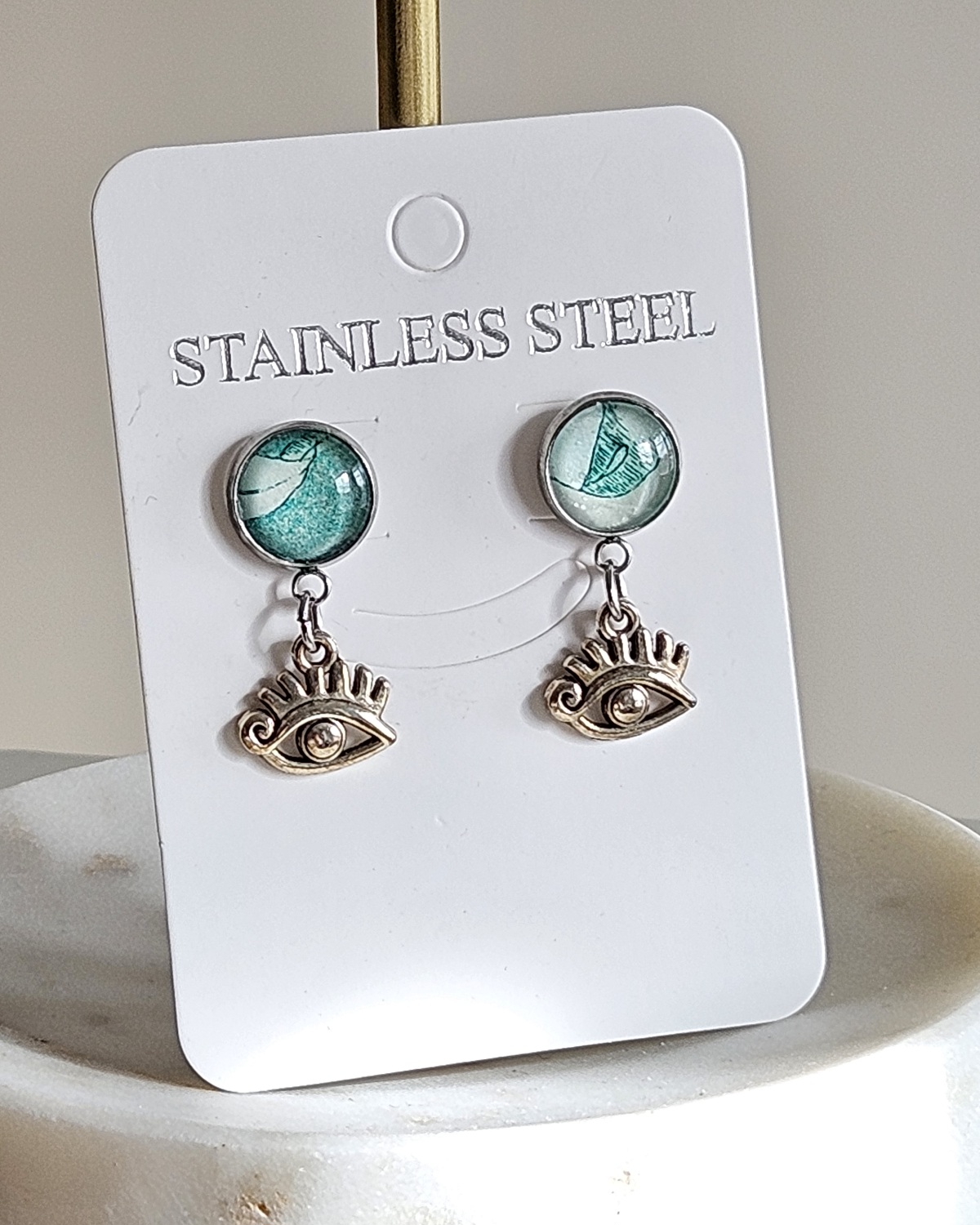 Vihreää grafiikkaa nappiosassa, silmäriipus somisteena. Korun pituus 2,6 cm. Materiaali kirurginteräs.
