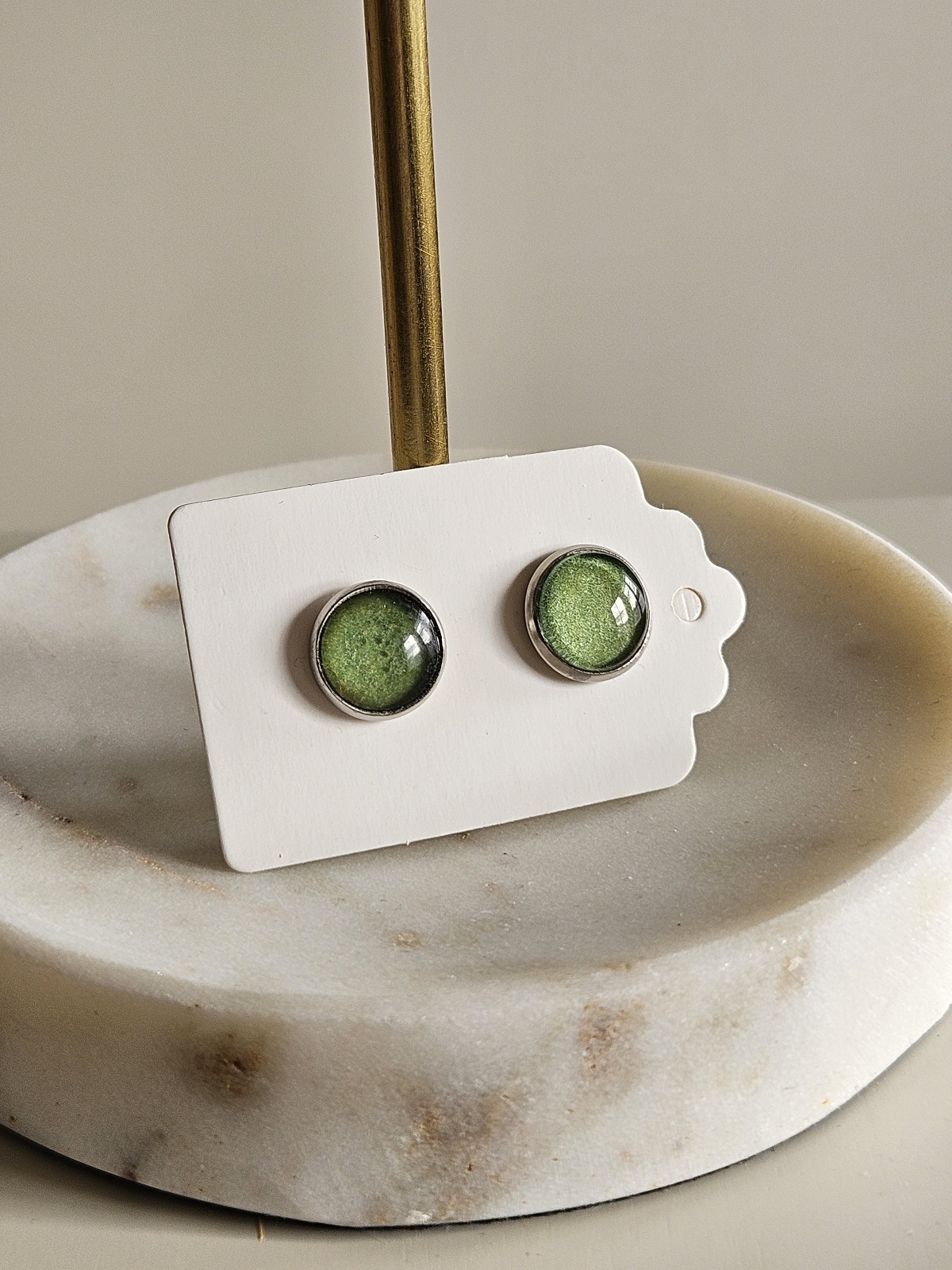 Lasin alla pieni pala taidegrafiikkaa. Korun halkaisija 10 mm. Materiaali kirurginteräs.