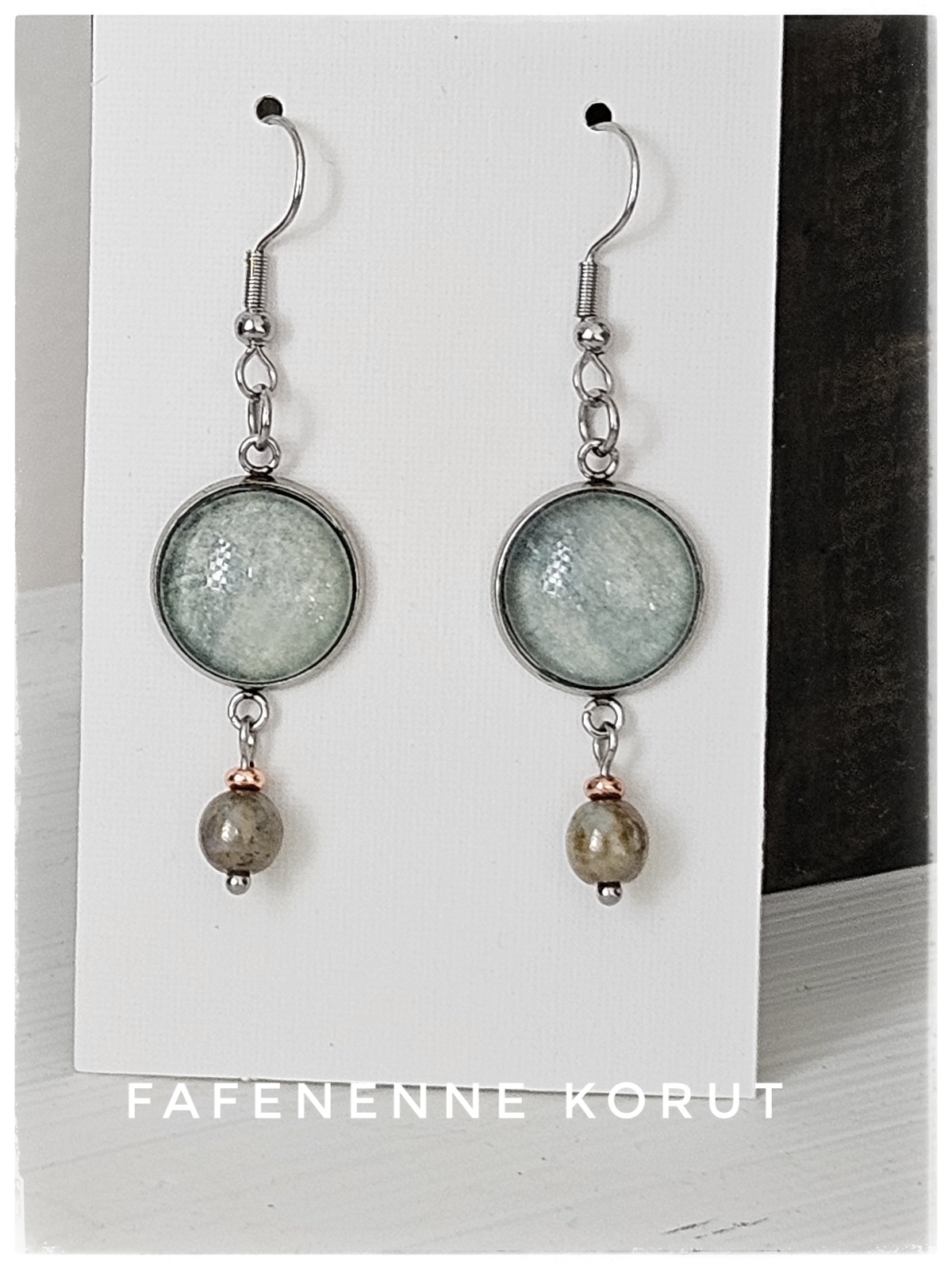 Upeat uniikit korut, joissa lasin alla taidegrafiikkaa. Koko korun korkeus n 5,5 cm. Metalliosat kirurginterästä, helmet kivihelmiä.