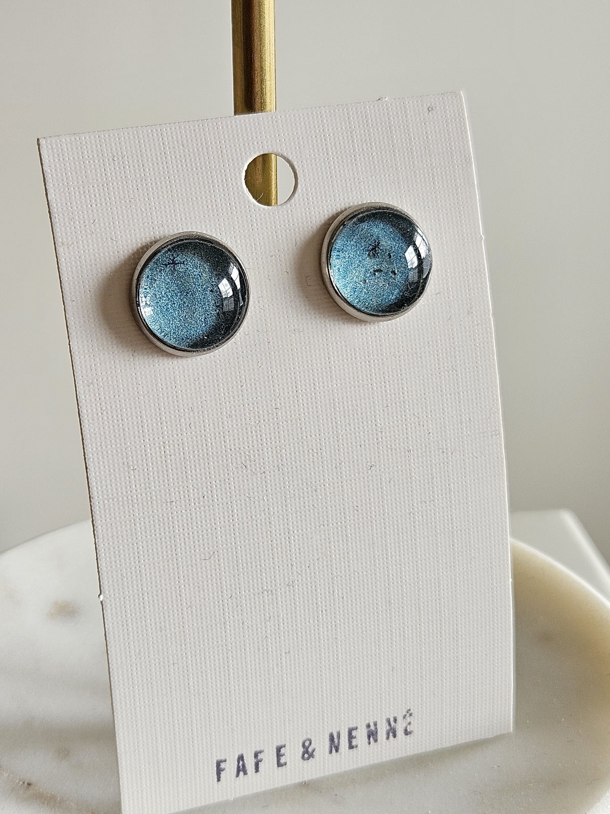 Lasin alla pieni pala taidegrafiikkaa. Korun halkaisija 14 mm. Materiaali kirurginteräs.