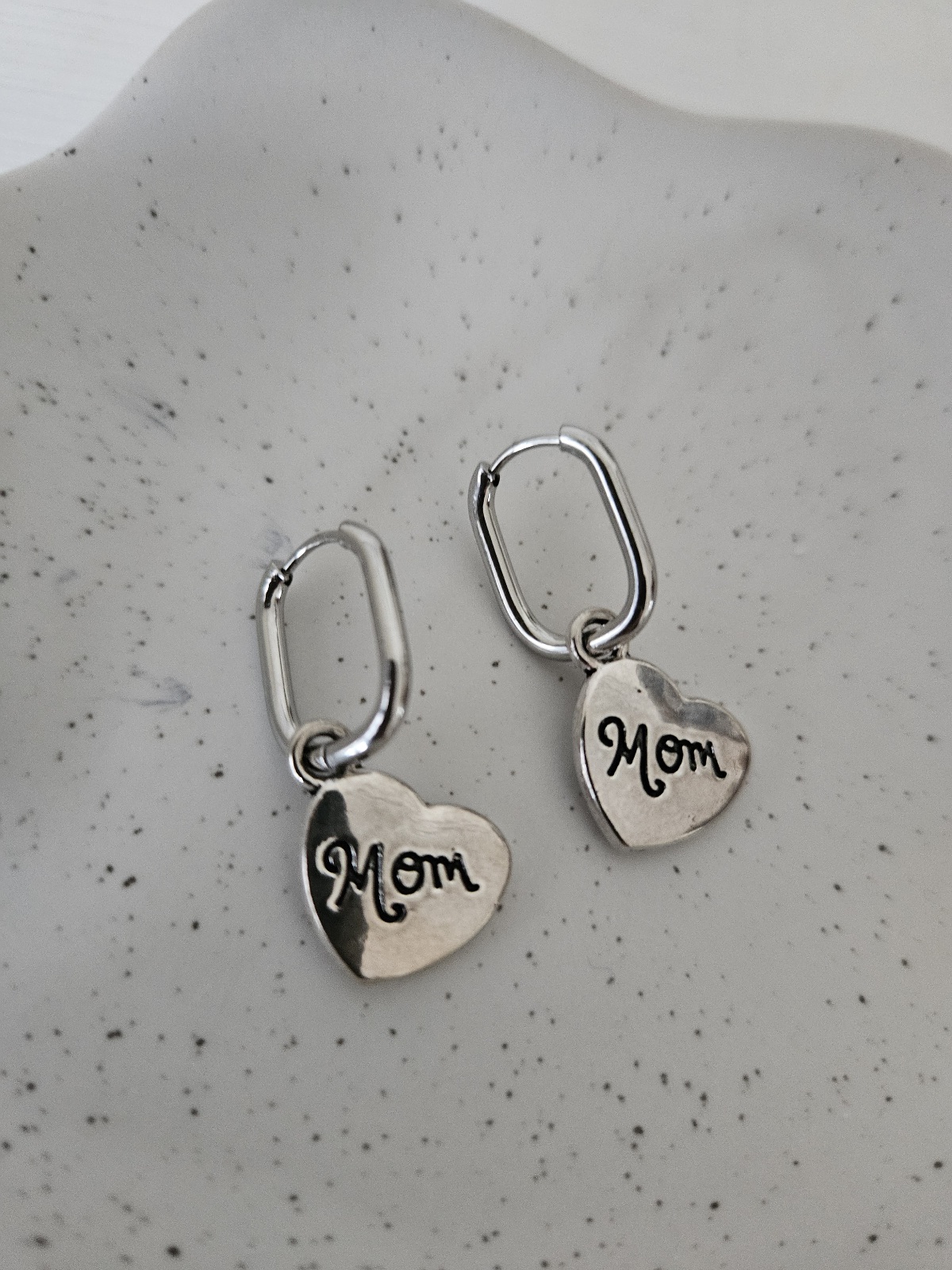 Kulmikkaissa renkaissa koristeena sydän jossa teksti mom. Rengas kirurginterästä. Korun pituus 3 cm.