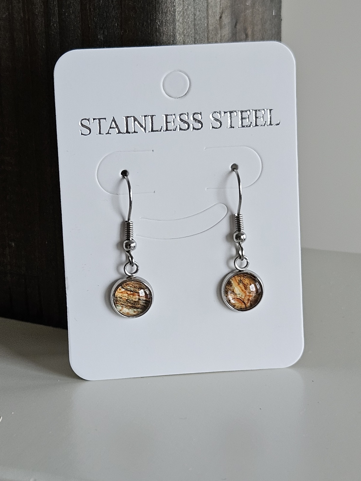 Uniikit pienet korvakorut, joissa taidegrafiikkaa laskikuvun alla. Korun korkeus 3 cm. Koukun materiaali ruostumaton, eli ns kirurginteräs.