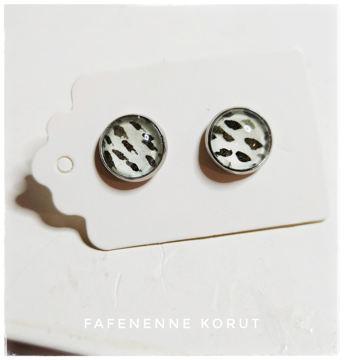Lasin alla pieni pala mustekynäpiirrosta. Jokainen koru on uniikki. Korun halkaisija 10 mm. Materiaali kirurginteräs.
