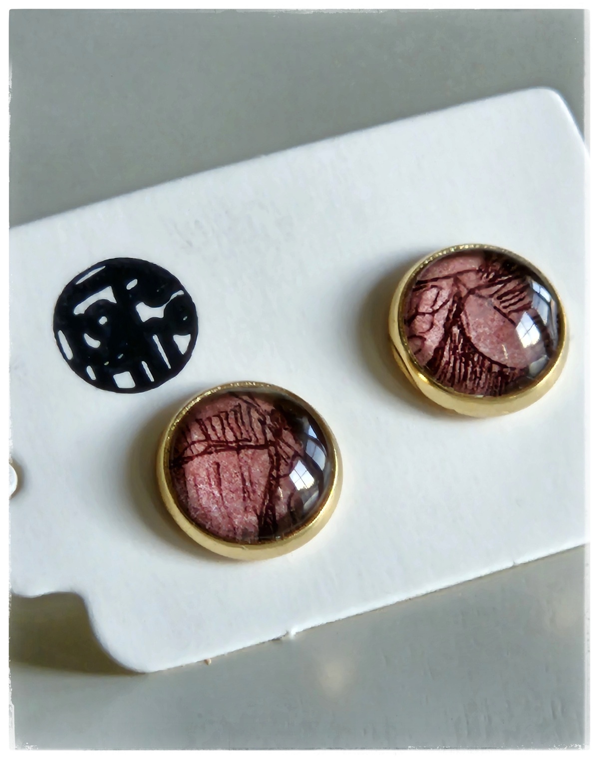 Lasin alla pieni pala taidegrafiikkaa. Jokainen koru on uniikki. Korun halkaisija 10 mm. Materiaali kullattu kirurginteräs.