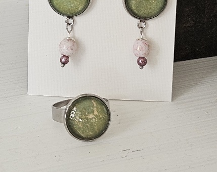 Sormus jossa sisällä pala taidegrafiikkaa. Sormus säädettävä. Materiaali kirurginteräs. Kapussin koko 14mm.