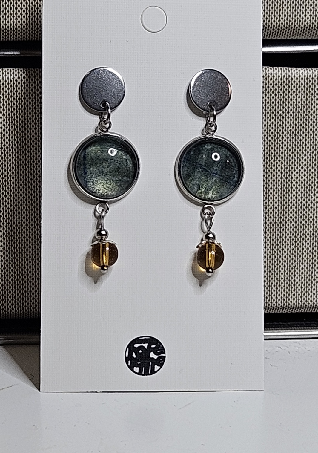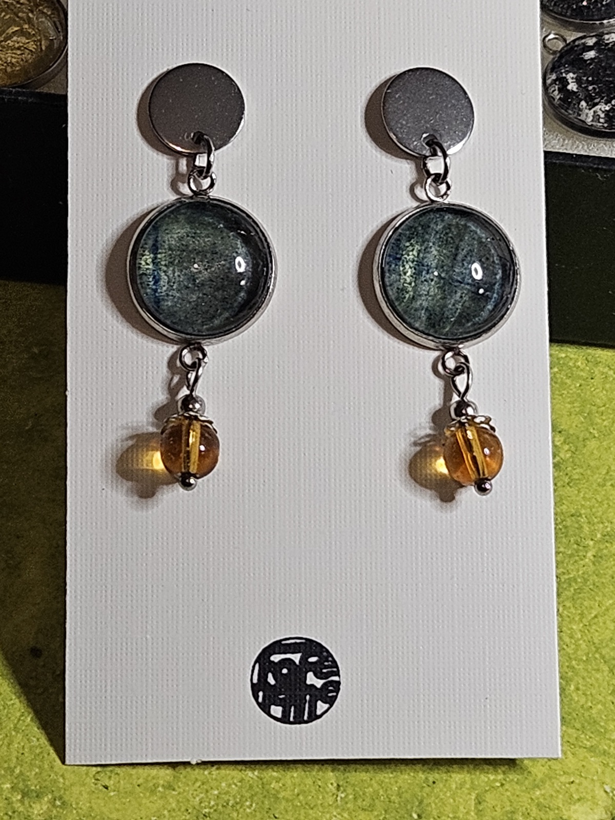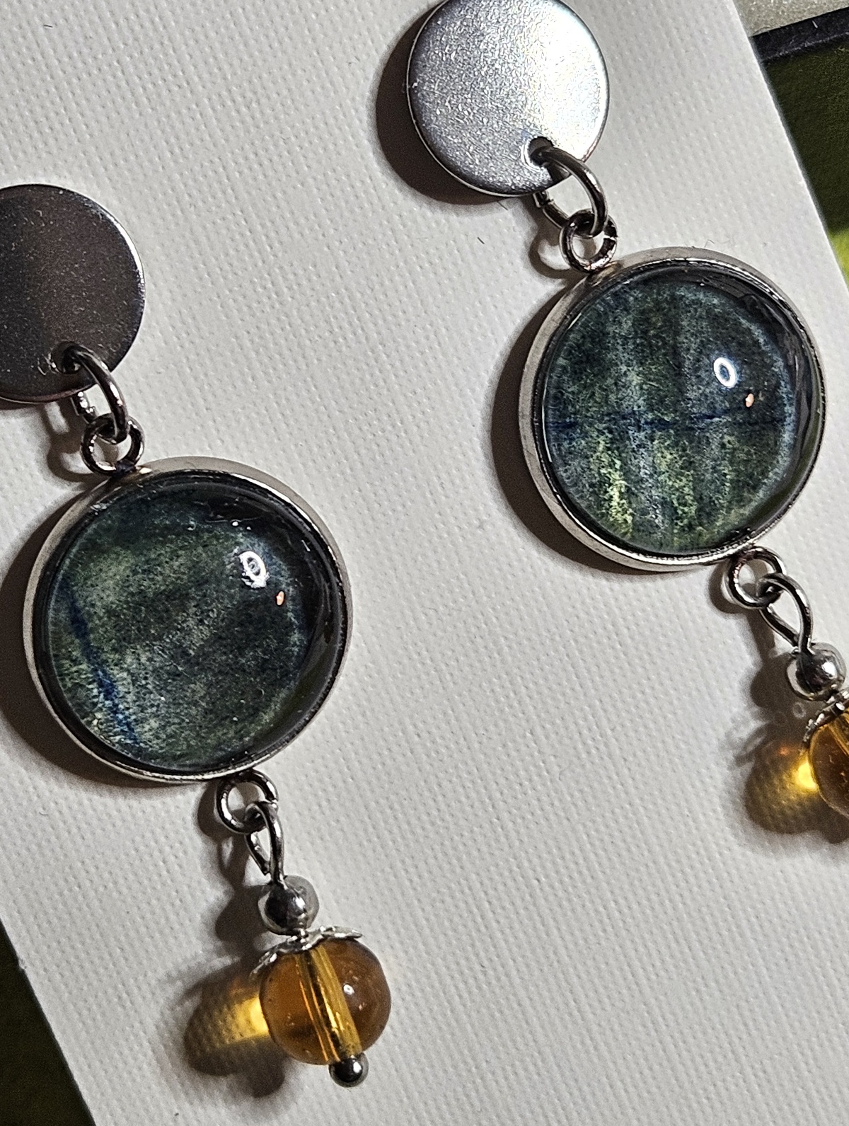 Upeat uniikit korut, joissa lasin alla taidegrafiikkaa. Koko korun korkeus n 4,5 cm. Metalliosat kirurginterästä, helmet akryyliä.