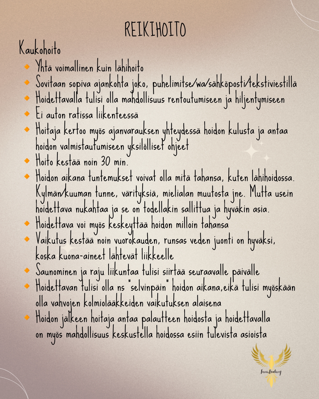 Ostettuasi hoidon verkkokaupasta saan ilmoituksen ostostasi. Maksun yhteydessä ilmoitat yhteystietosi, jotta voin ottaa sinuun yhteyttä ja sovimme sinulle hoitoajan. Halutessasi voit myös ensin varata hoitoajan ottamalla yhteyttä whatsappviestillä tai soittamalla, jolloin sovimme hoitoajan. Sen jälkeen voit käydä verkkokaupassa maksamassa hoidon. Suosittelen, että olet hoidon aikana omassa rauhassa, mahdollisimman häiriöttömässä tilassa. Näin hyödyt itse hoidosta parhaiten. Sinun ei tarvitse välttämättä kertoa etukäteen, mihin asiaan haluat hoitoa, sillä toimin energian välittäjänä. Reiki kulkeutuu oikeaan paikkaan sinun parhaaksesi. Reiki ei korvaa lääketieteellistä hoitoa, mutta se sopii loistavasti tukihoitomuodoksi. Kirjoitan hoidosta sinulle lyhyen raportin, jonka lähetän sinulle sovitulla tavalla. Hoidon jälkeen voit myös ottaa yhteyttä, mikäli sinulla on jotain kysyttävää hoitoosi liittyen.