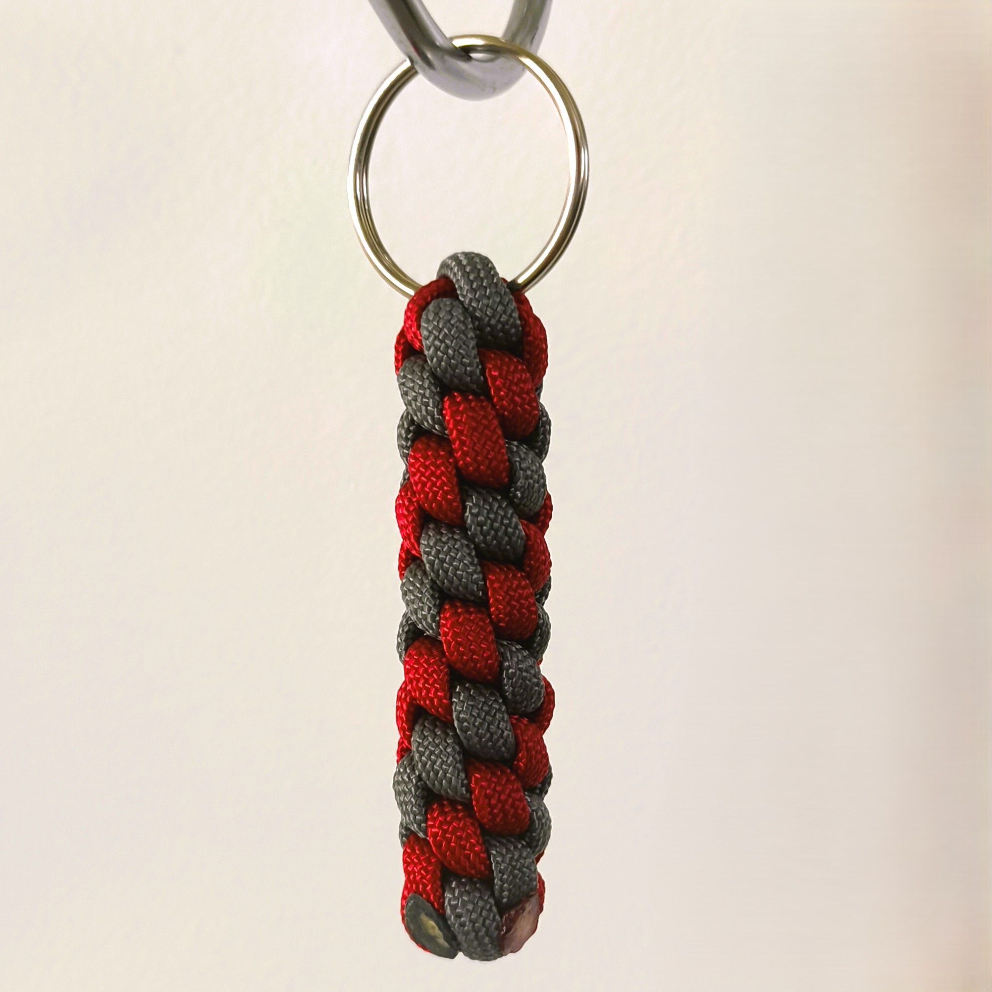 This stylish keyring is made of 550 Type III Paracord and comes with a silver-coloured split ring (2cm diameter). It is approximately 6cm long, 1,5 cm wide (without the splitring) and can be made in any of the offered colours.