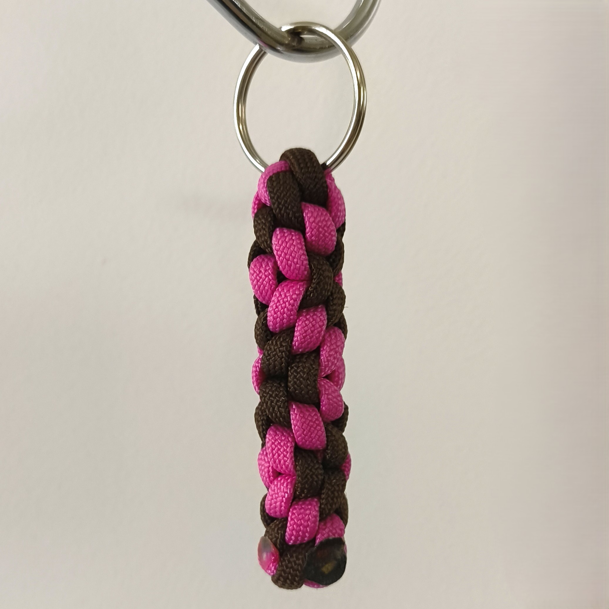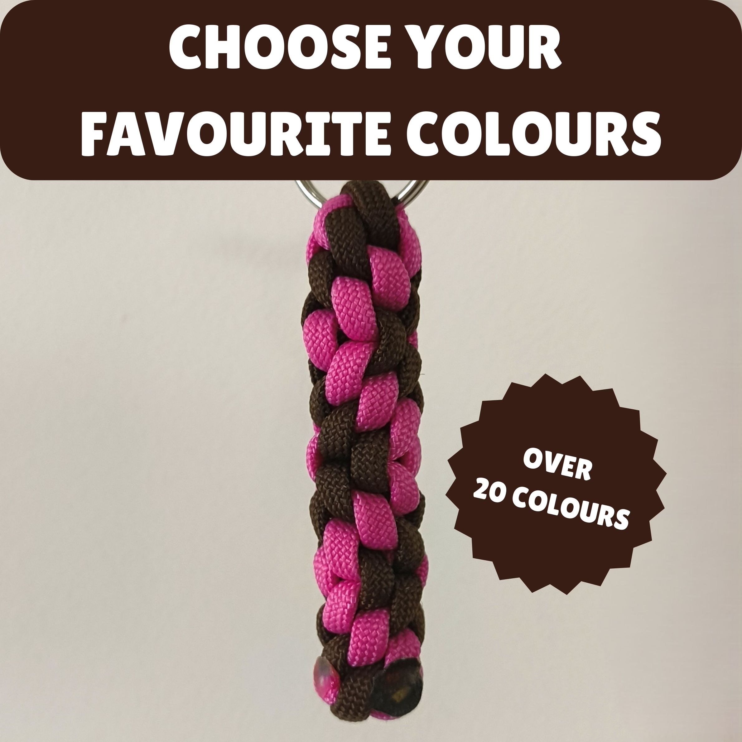 This stylish keyring is made of 550 Type III Paracord and comes with a silver-coloured split ring (2cm diameter). It is approximately 7cm long, 1,5 cm wide (without the split ring) and can be made in any of the offered colours.