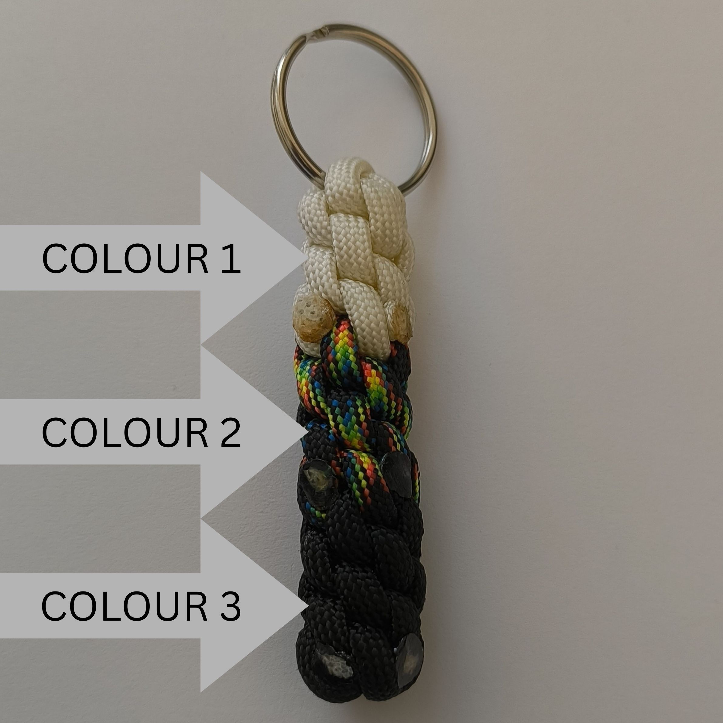 This colourful keyring is made of 550 Type III Paracord and comes with a silver-coloured split ring (2cm diameter). It is approximately 7 cm long, 1,5 cm wide (without the split ring) and can be made in any of the offered colours.
