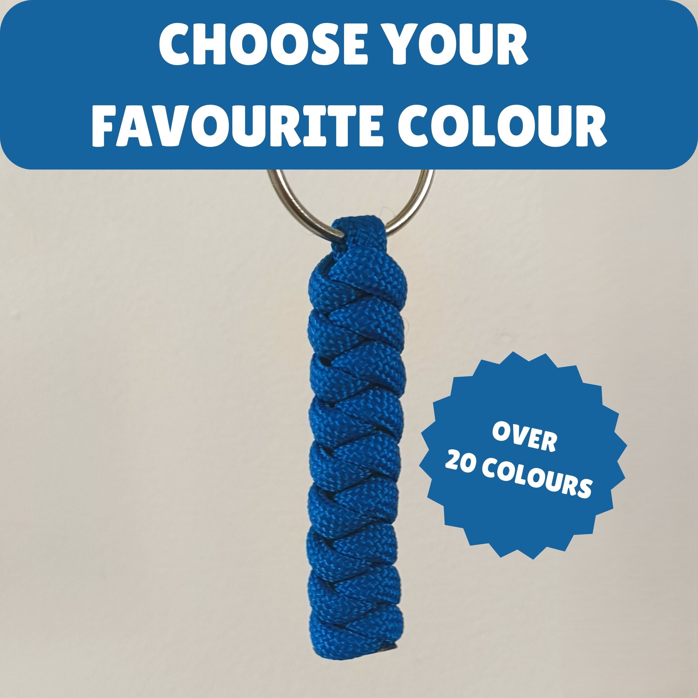 This simple yet stylish keyring is made of 550 Type III Paracord and comes with a silver-coloured split ring (2cm diameter). It is approximately 6cm long, 1cm wide (without the splitring) and can be made in any of the offered colours.