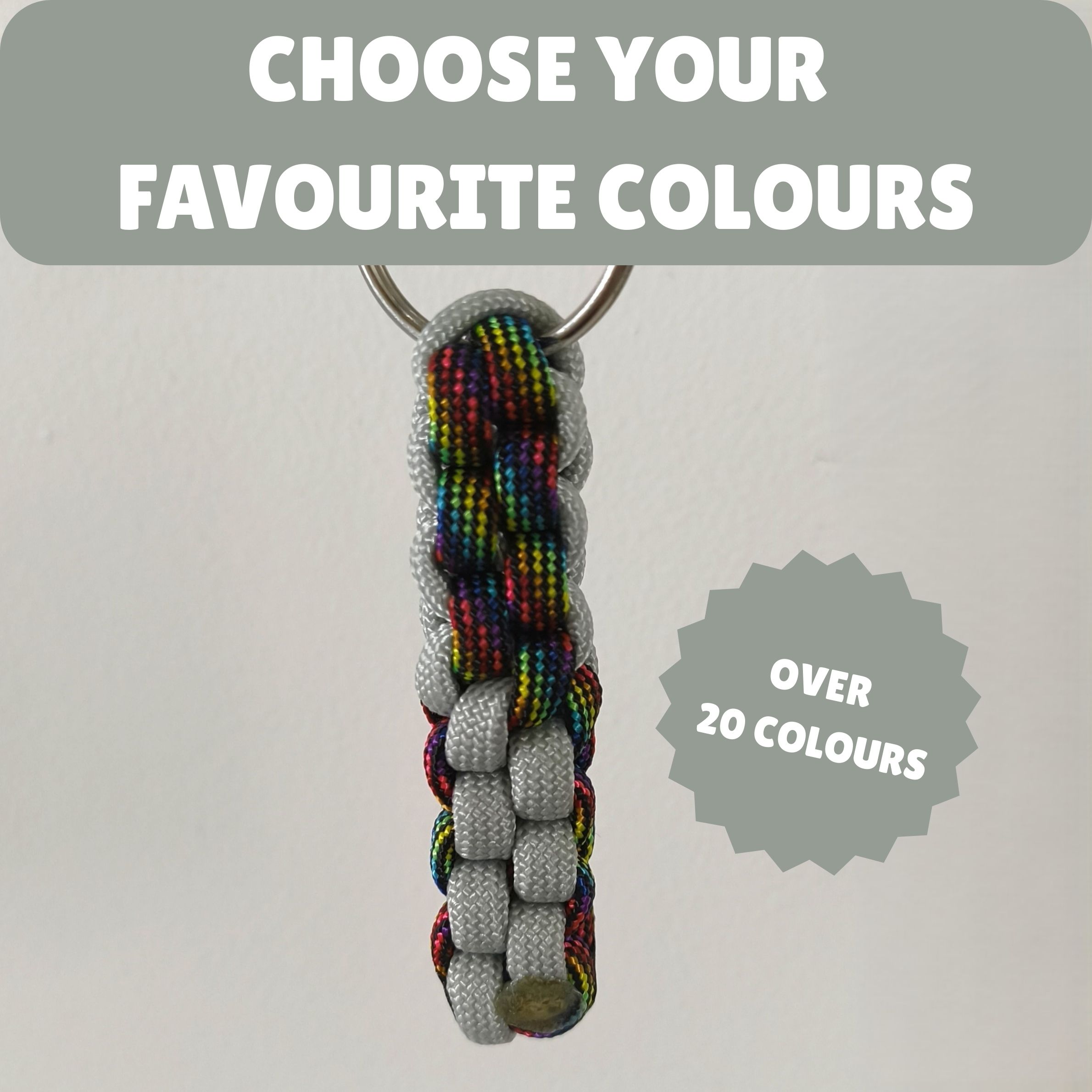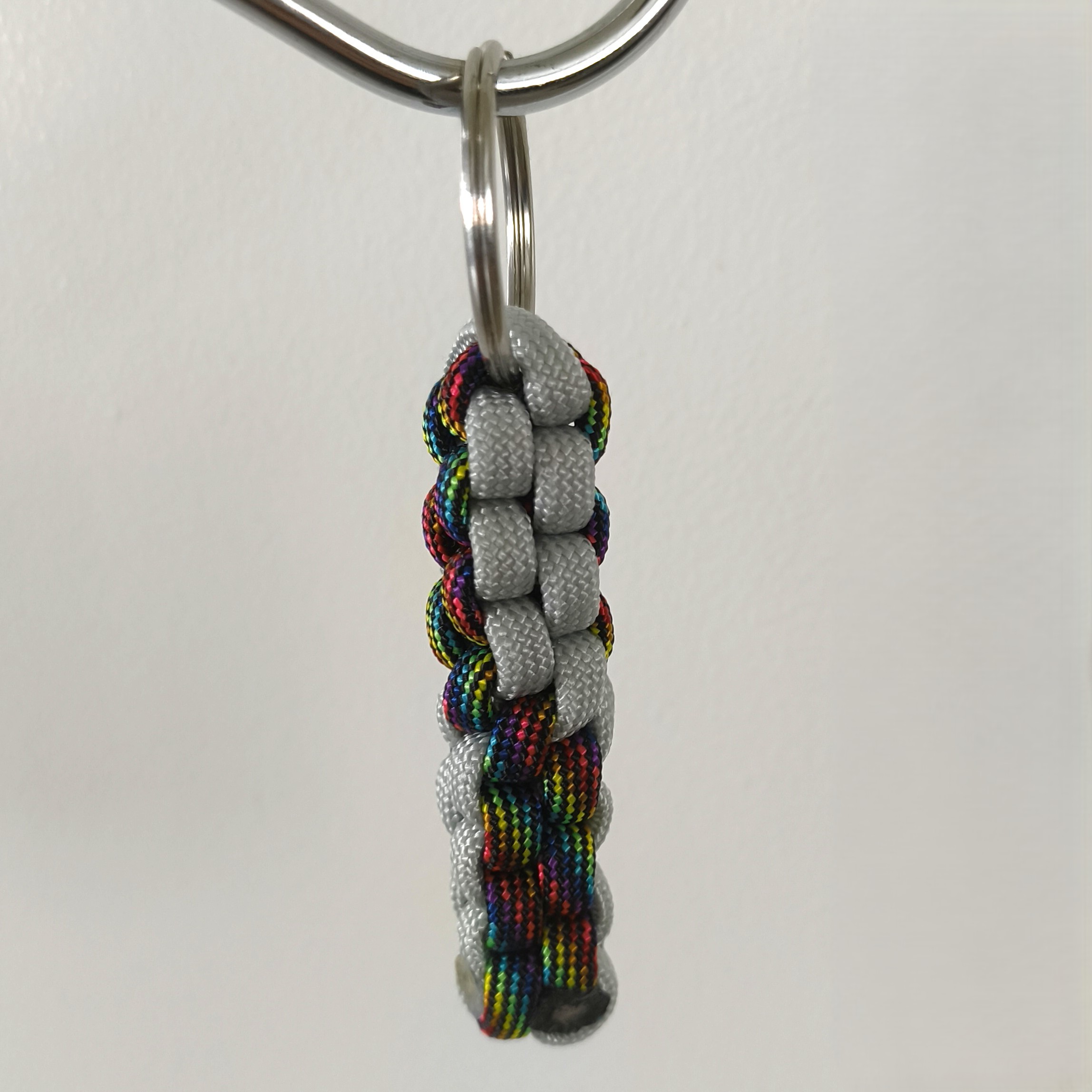 This stylish keyring is made of 550 Type III Paracord and comes with a silver-coloured split ring (2cm diameter). It is approximately 6cm long, 1,5cm wide (without the splitring) and can be made in any of the offered colours.
