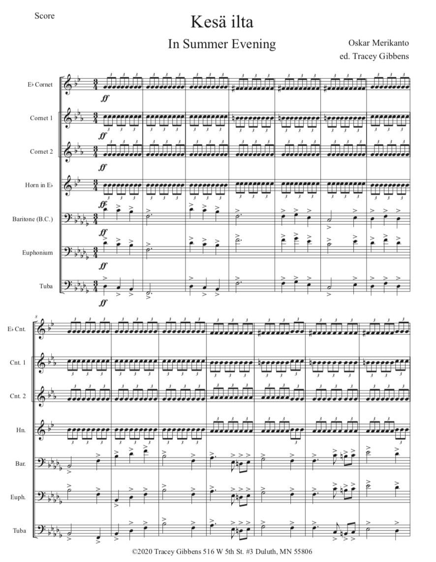 The Finnish Brass in America Series is scored primarily for original Finnish brass septet: E flat Soprano Cornet, two B flat Cornets, an E flat Alto Horn, a B flat Tenor Horn, and Euphonium, and a Tuba. However, these sets also include alternate parts for flute (piccolo), clarinet, French horn, and tenor saxophone. The original seven parts can also be played by other instrumentalists who read those clefs and transpositions (tenor saxophone, bassoon, bass clarinet, etc.) While many of us in Ameriikan poijat have contributed arrangements to this series, it has been primarily of work of Tracey Gibbens, with editing by Russell Pesola and Paul Niemisto.