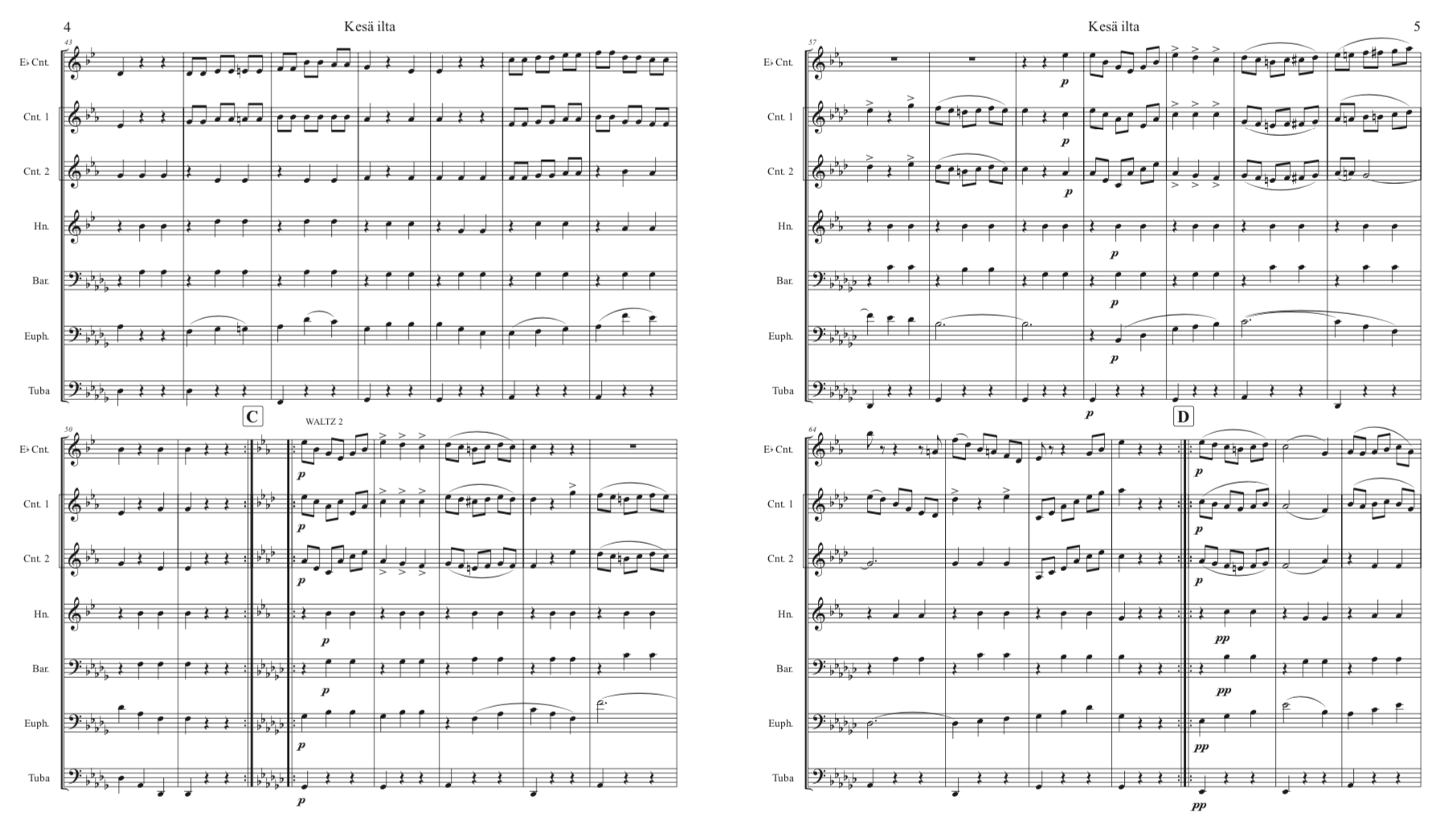 Standard Finnish septet : E-flat soprano cornet, B-flat cornet I, B-flat cornet II, E-flat alto, B-flat tenor , B-flat baritone, BB-tuba (concert pitch Bass Clef). Our wish is that brass players will try the conical brass instrumentation, but also welcome playing by mixed wind bands.
