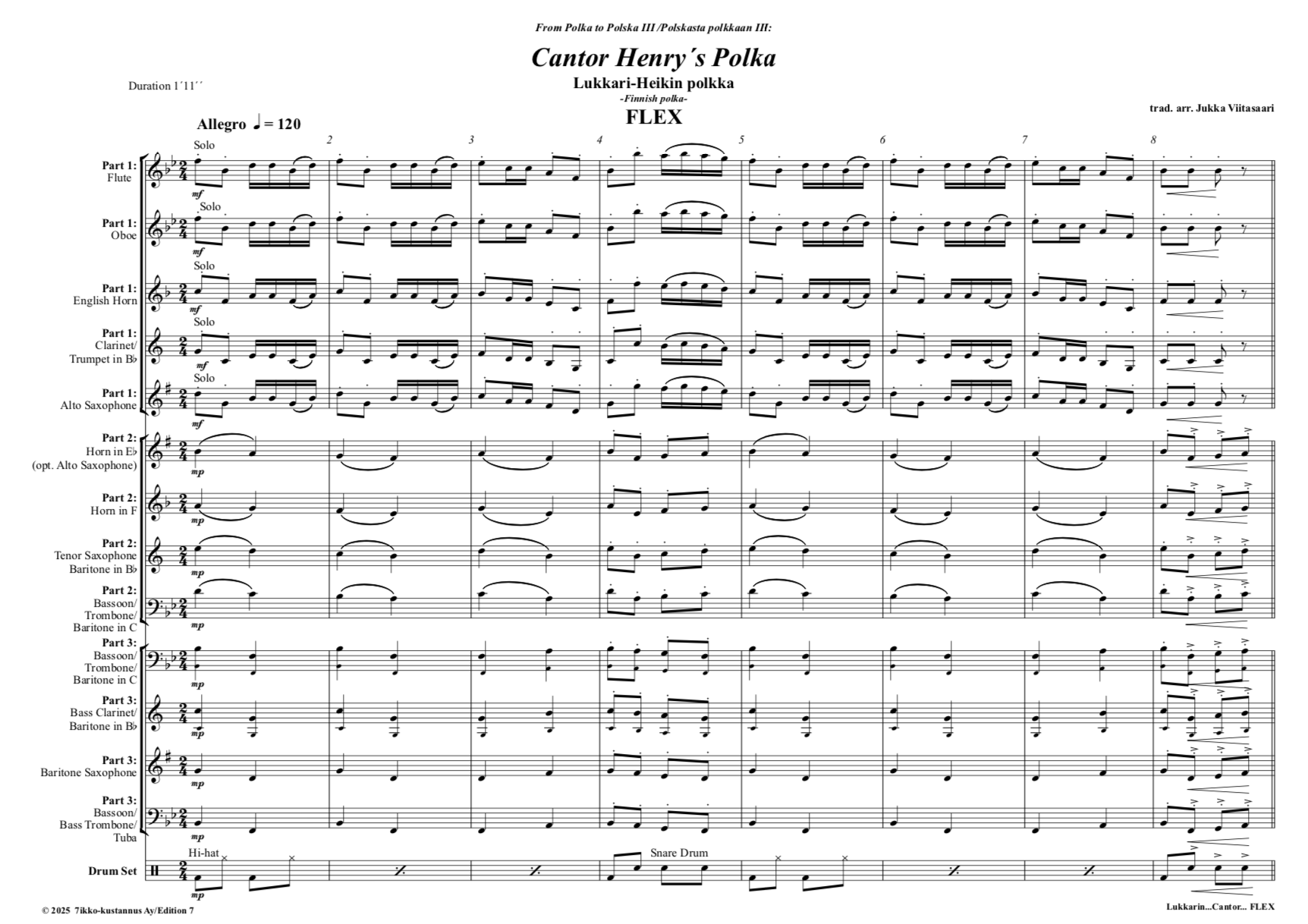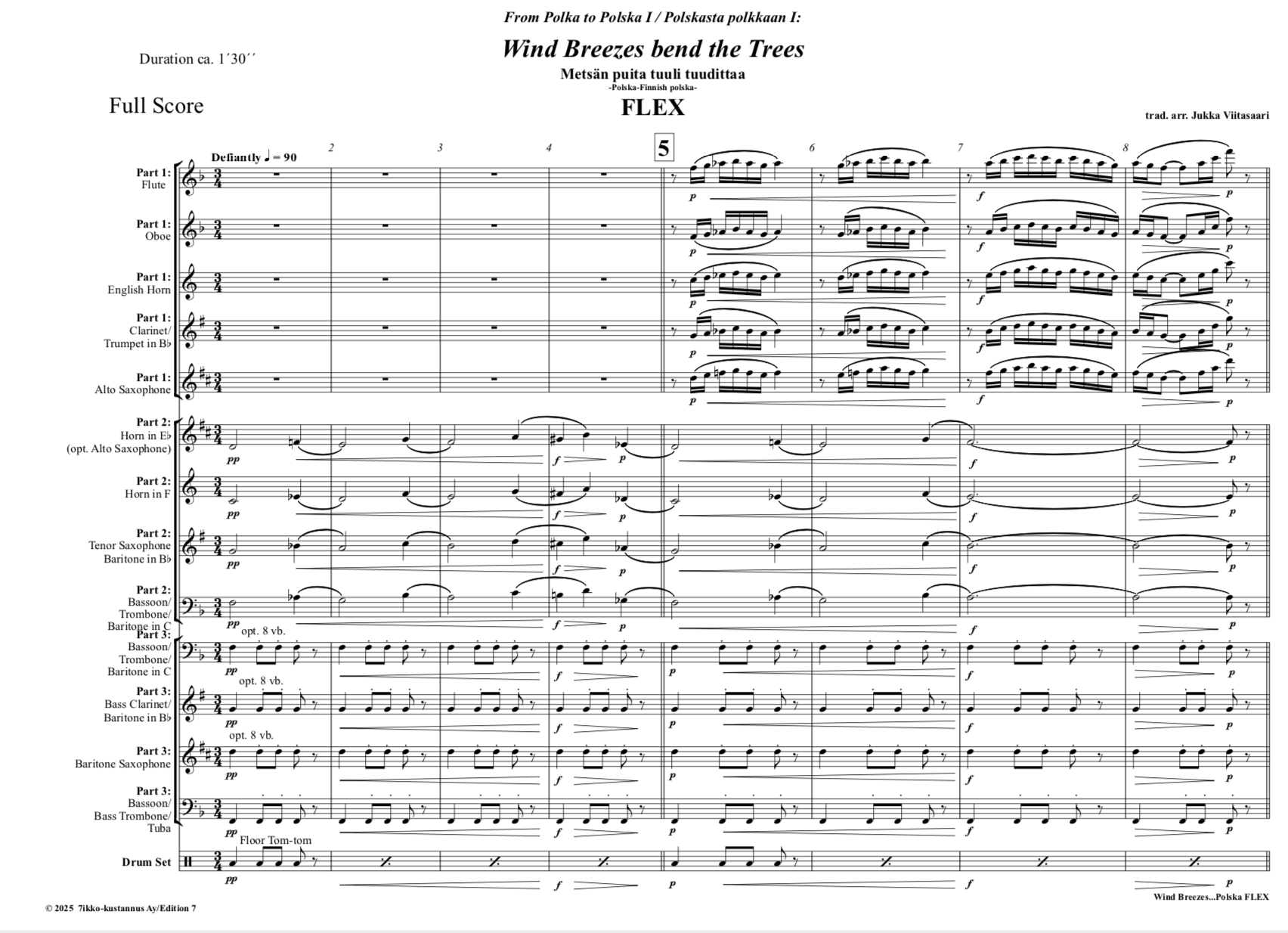 Part 1: Flute - Oboe - English Horn - Clarinet, Trumpet in Bb - Alto Saxophone Part 2: Horn in Eb (opt. Alto saxophone) - Horn in F - Tenor Saxophone, Baritone in Bb - Bassoon/Trombone/Baritone in C Part 3: Bassoon, Trombone, Baritone in C - Bass Clarinet, Baritone in Bb - Baritone Saxophone - Bassoon, Bass Trombone, Tuba Optional Drum Set