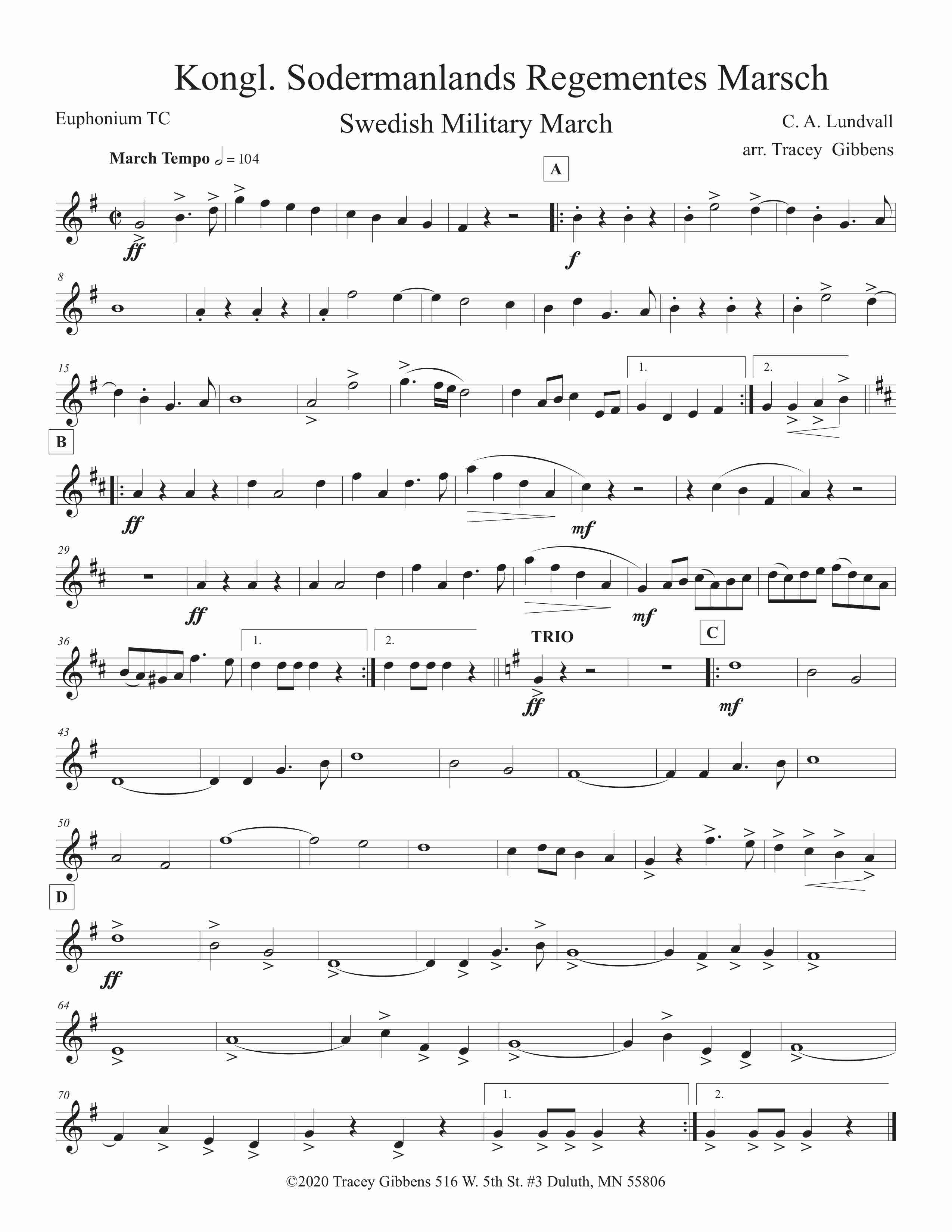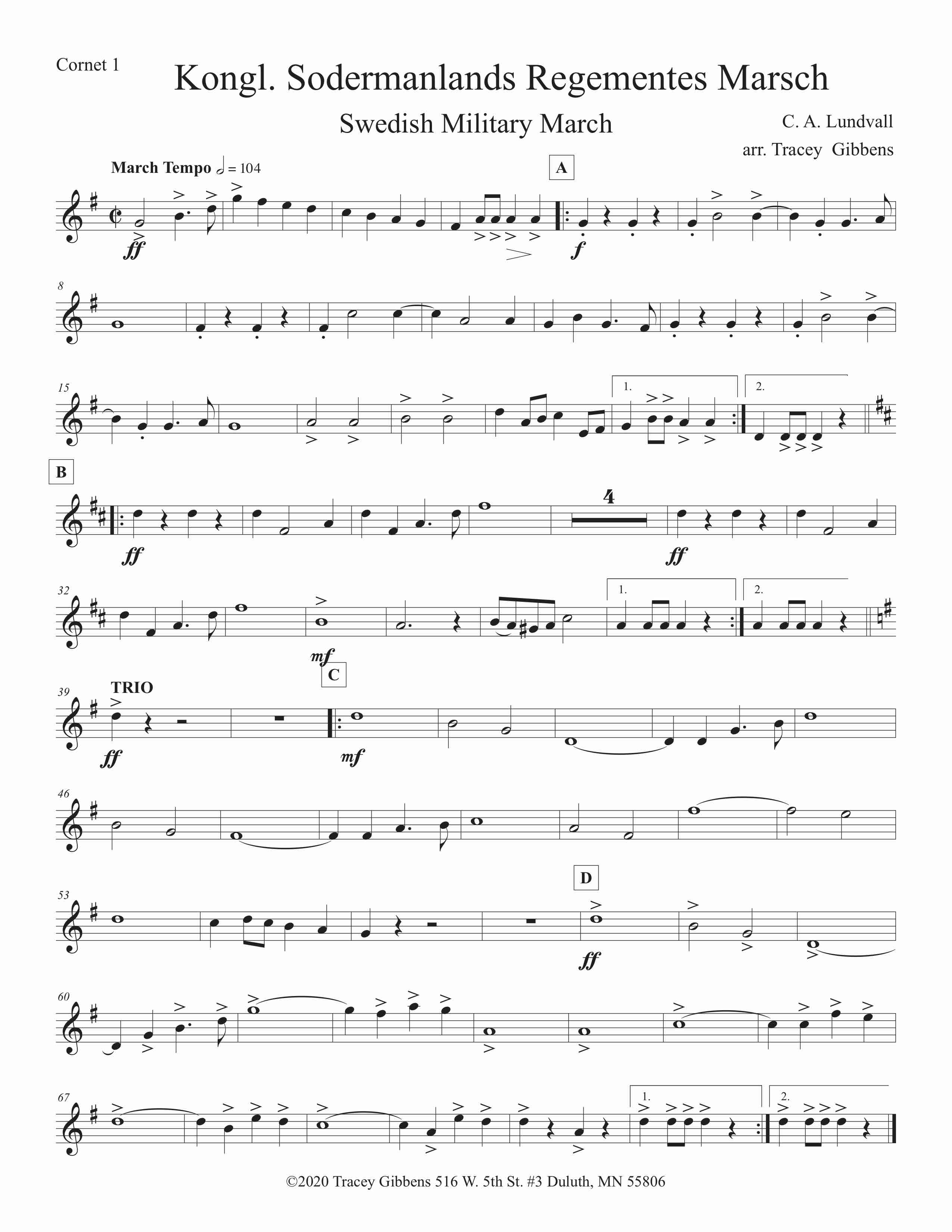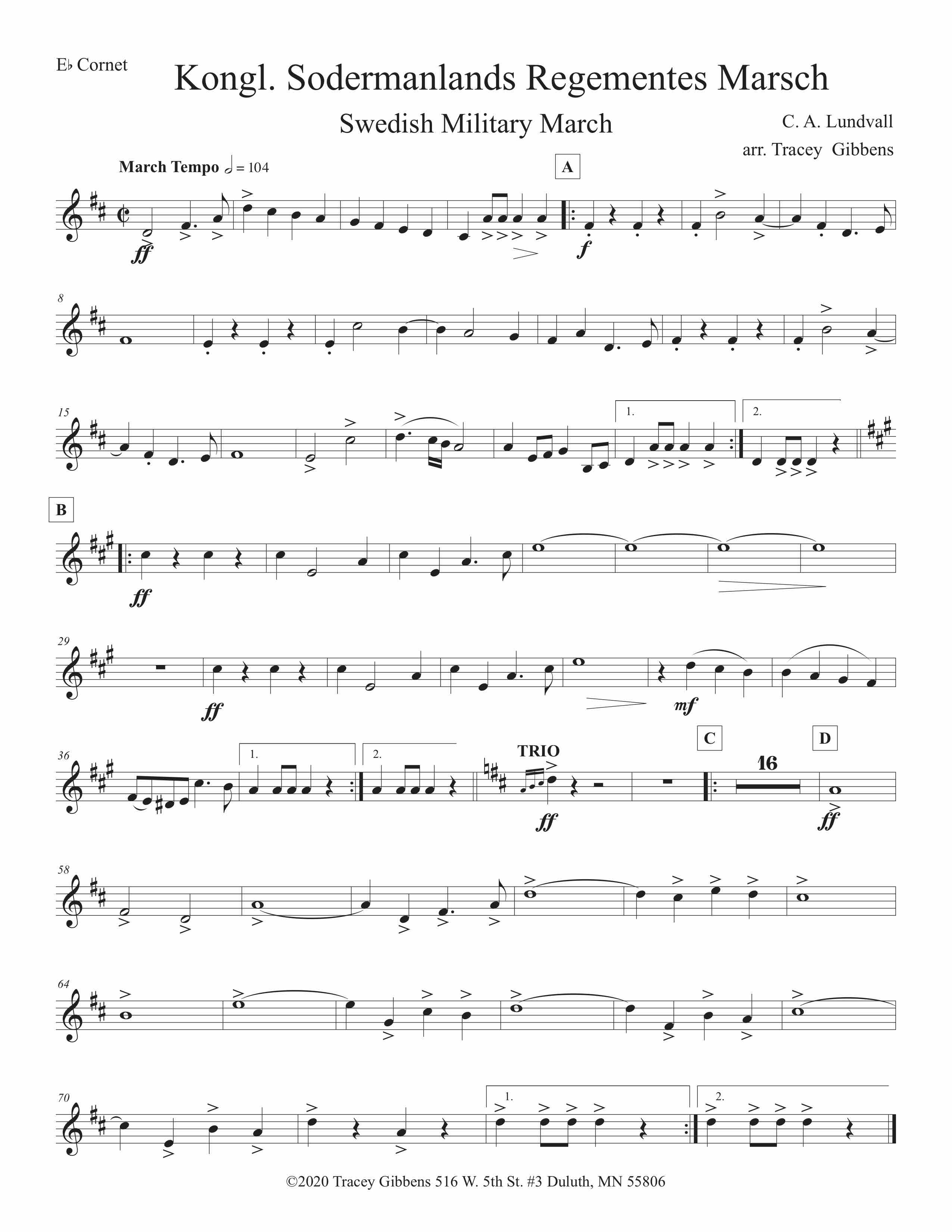 Kongl. Södermanlands Regementes Marsch is a popular Swedish Military March by C. A. Lundvall. Tracey heard a recording of it and was smitten. This septet score was assembled by him by ear. The march is played regularly at the changing of the Guard in Stockholm, where a mounted brass band always plays. That band is virtuosic and a model for us.