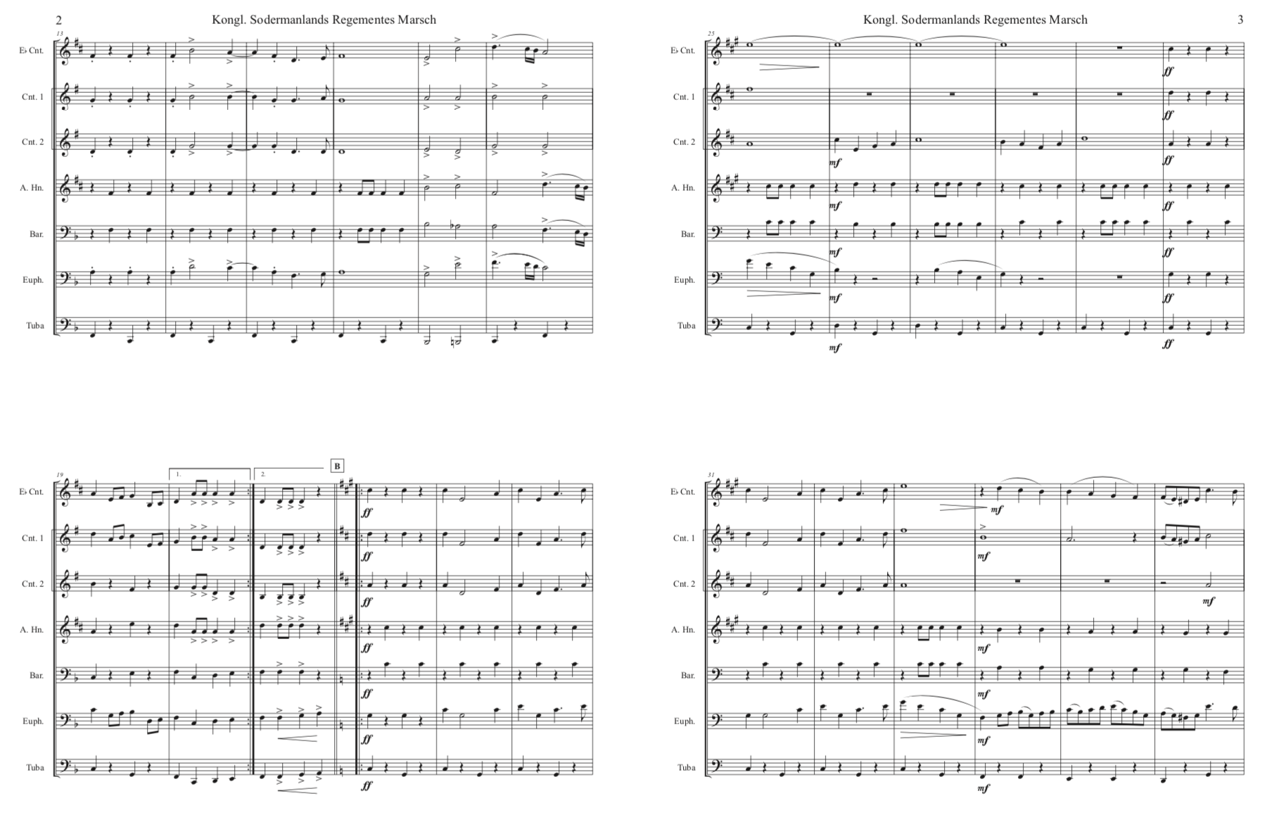 Standard Finnish septet : E-flat soprano cornet, B-flat cornet I, B-flat cornet II, E-flat alto, B-flat tenor , B-flat baritone, BB-tuba (concert pitch Bass Clef). Our wish is that brass players will try the conical brass instrumentation, but also welcome playing by mixed wind bands.