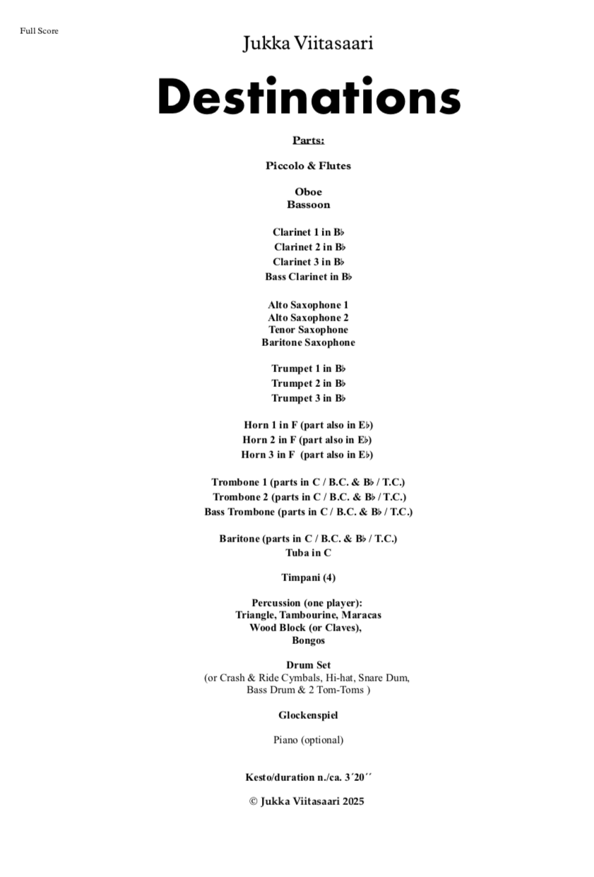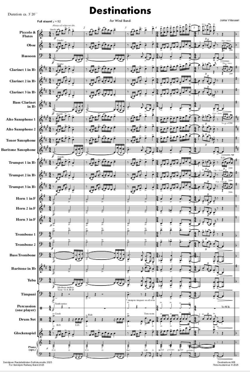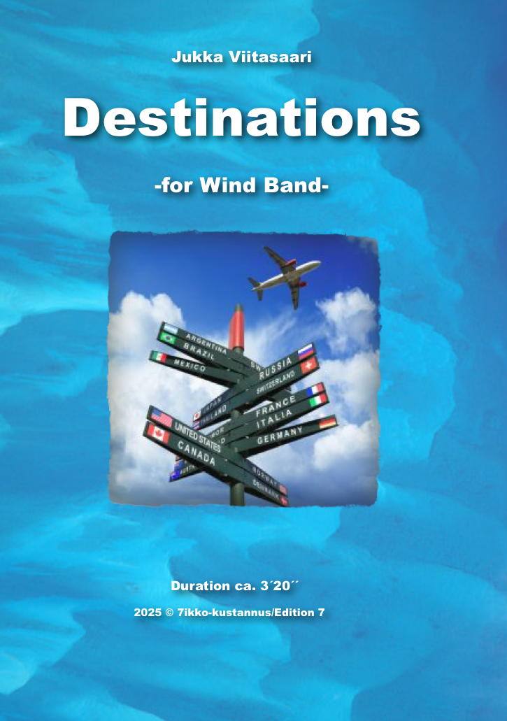 "Destinations" (3´20´´) was commissioned by Seinäjoen Rautatieläisten Soittokunta/The Seinäjoki Railway Workers Band, conducted by Arto Panula.