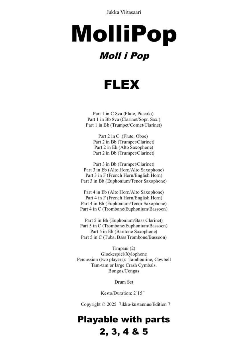The purchase includes both the score and the individual parts in PDF format. Seller: 7ikko-kustannus/Edition 7 - 7ikkokustannus@gmail.com
