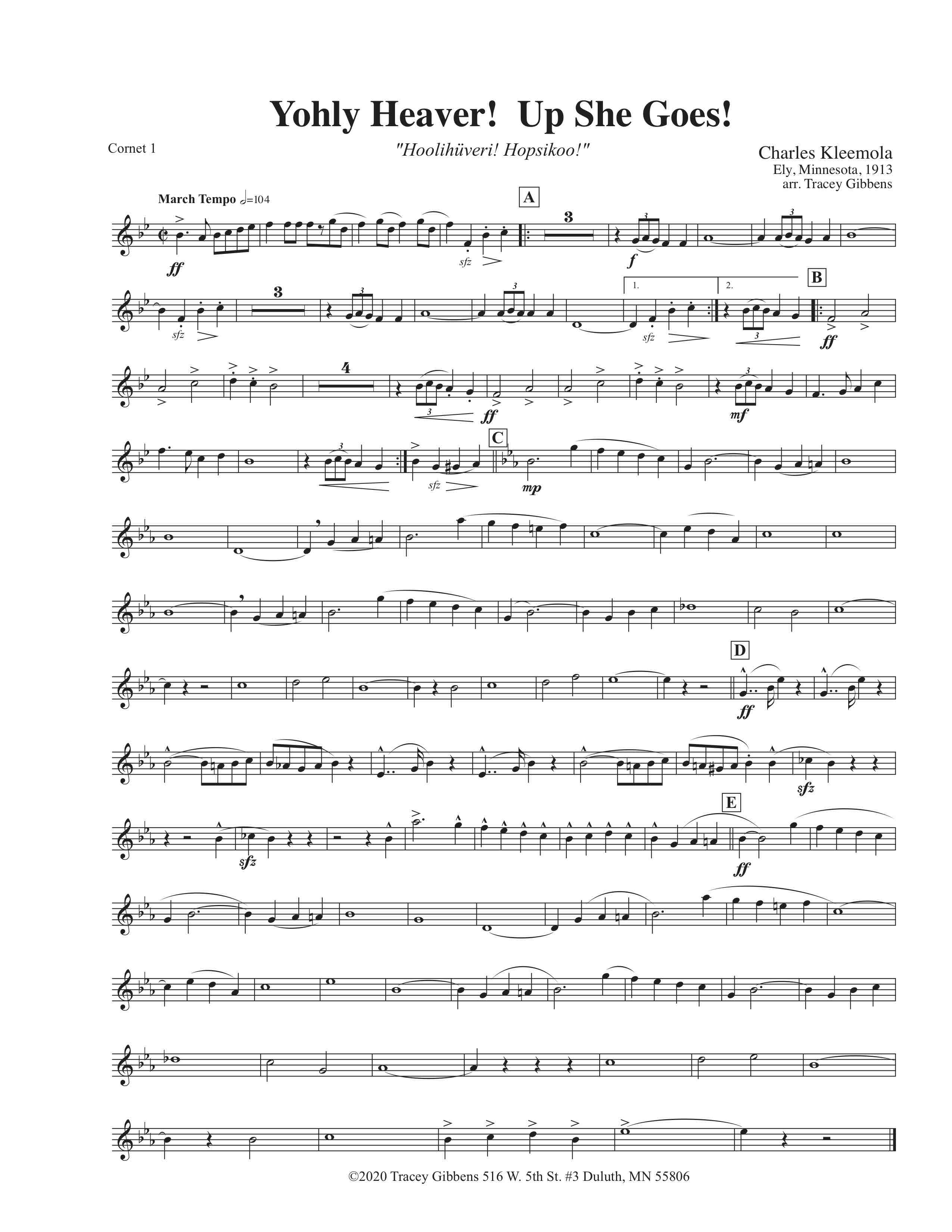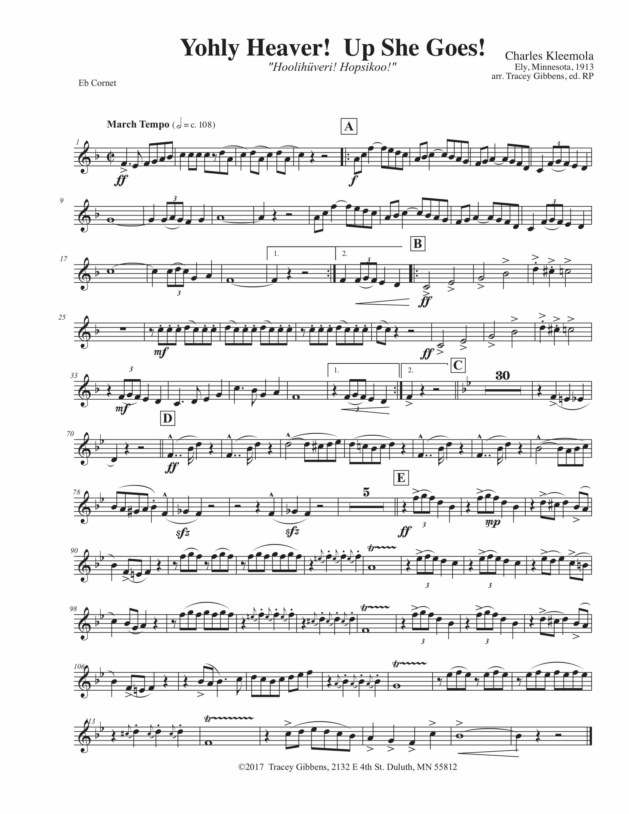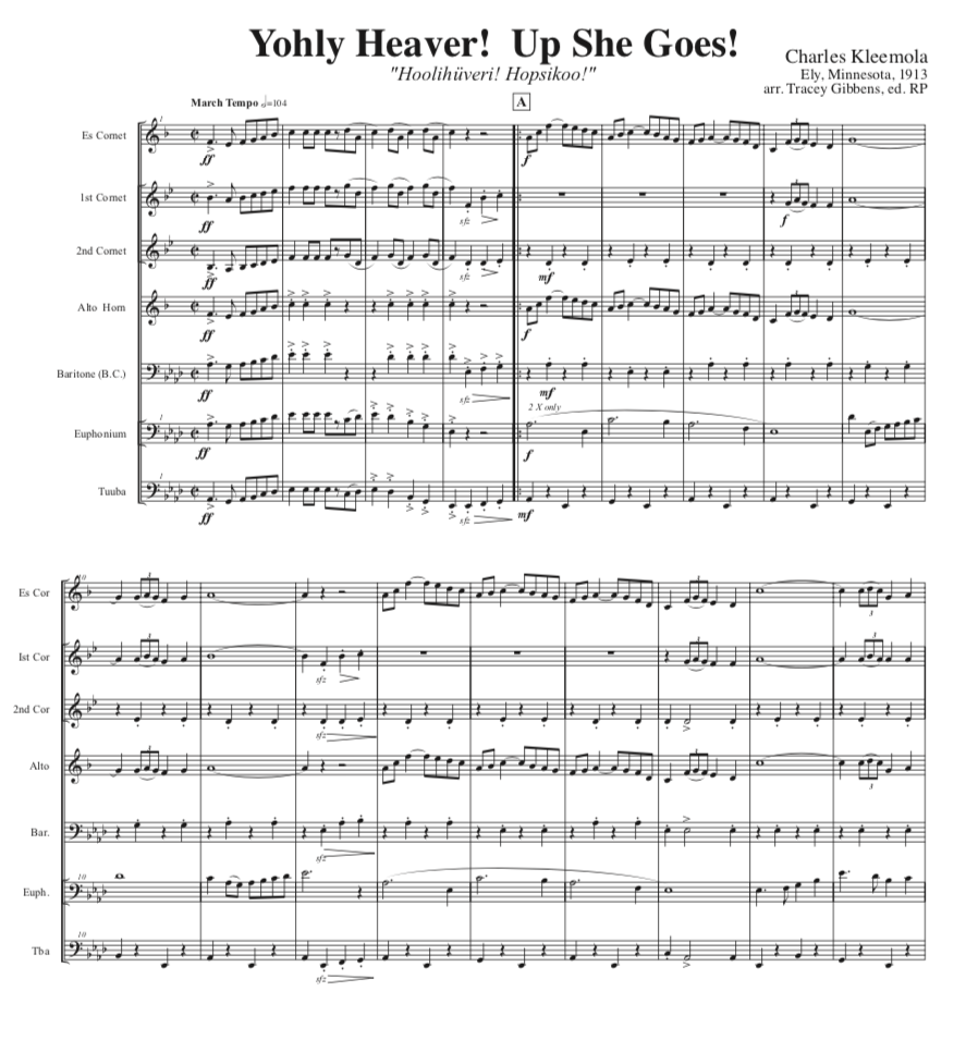 Johli hiiveri, hopsikko! marssi (Yohli Heaver Up She Goes March) – by Charles Kleemola (1880- 1915). Kleemola was born in Finland and came to Monessen, Pennsylvania as a boy where he apparently began to play cornet. His family moved to Ironwood, Michigan, where he eventually played with the local National Guard Band during the Spanish American War. He went on to Ely Minnesota where he led the very successful “Sampo” Band for several years. He also appears in photographs as a cornet player in many Finnish bands around the U.S. Yohli Heaver, probably written for a summer festival, celebrates the big steam powered log booms that loaded timber in an out of Ely’s Burnside Lake. The march is self-published and was found by us in the family’s collection. Kleemola wrote a school song for the earliest Ely High School Band, and probably had other works but they haven’t been found.