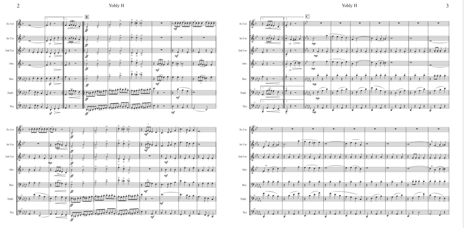 Additional parts provided: Part 1 in Bb, Part 1 in C, Part 2 in C, Part 3 in C, Part 4 in F, Part 5 in Bb treble, Part 6 in Bb treble, Part 7 in Bb treble (for bass clarinet). This should provide most parts for a standard concert band. Only limited percussion is included, but could be added ad lib. Additional parts in other transpositions can be requested.