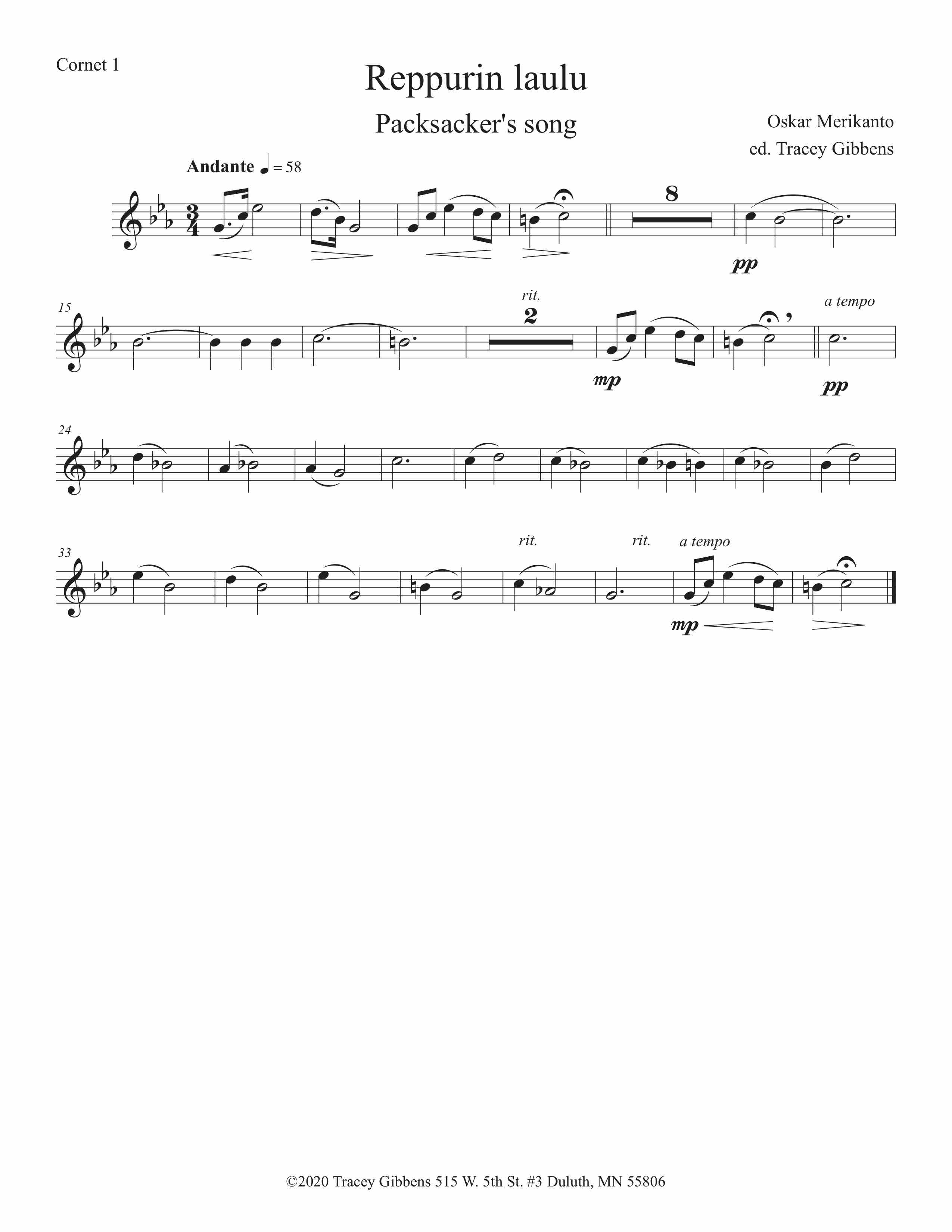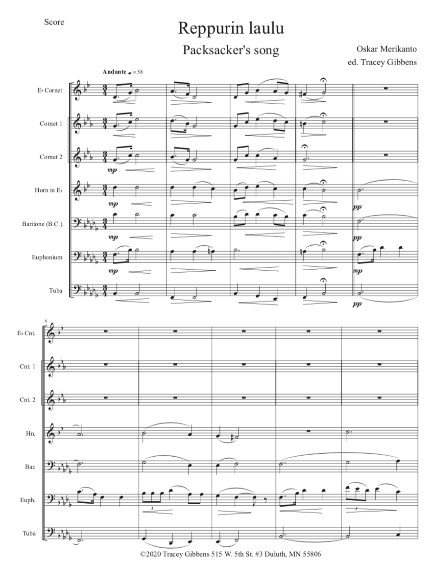 The Finnish Brass in America Series is scored primarily for original Finnish brass septet: E flat Soprano Cornet, two B flat Cornets, an E flat Alto Horn, a B flat Tenor Horn, and Euphonium, and a Tuba. However, these sets also include alternate parts for flute (piccolo), clarinet, French horn, and tenor saxophone. The original seven parts can also be played by other instrumentalists who read those clefs and transpositions (tenor saxophone, bassoon, bass clarinet, etc.) While many of us in Ameriikan poijat have contributed arrangements to this series, it has been primarily of work of Tracey Gibbens, with editing by Russell Pesola and Paul Niemisto.