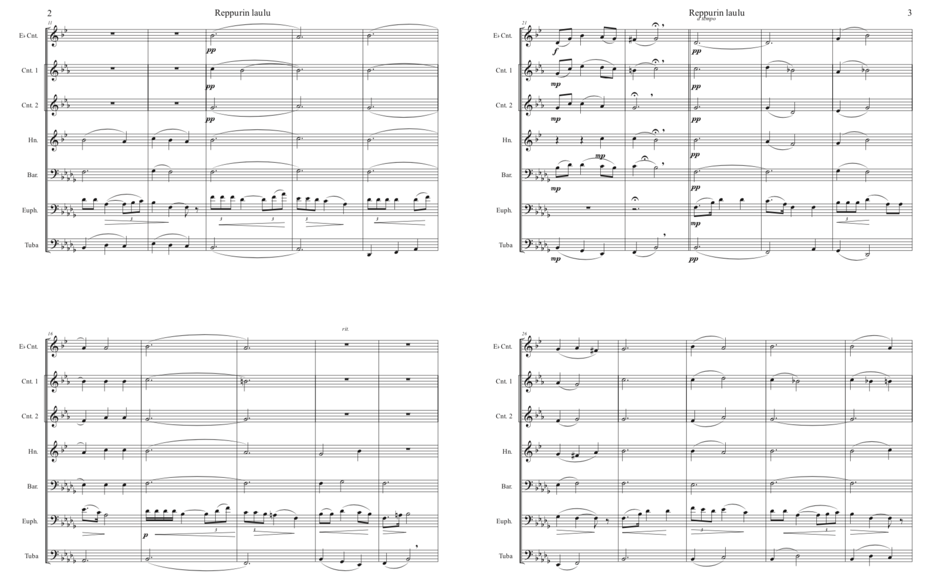 Standard Finnish septet : E-flat soprano cornet, B-flat cornet I, B-flat cornet II, E-flat alto, B-flat tenor , B-flat baritone, BB-tuba (concert pitch Bass Clef). Our wish is that brass players will try the conical brass instrumentation, but also welcome playing by mixed wind bands.