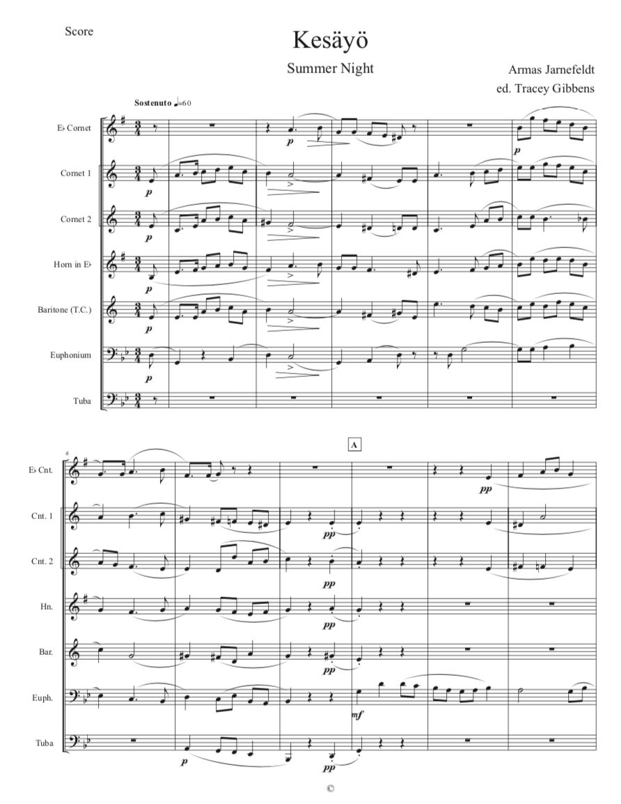 The Finnish Brass in America Series is scored primarily for original Finnish brass septet: E flat Soprano Cornet, two B flat Cornets, an E flat Alto Horn, a B flat Tenor Horn, and Euphonium, and a Tuba. However, these sets also include alternate parts for flute (piccolo), clarinet, French horn, and tenor saxophone. The original seven parts can also be played by other instrumentalists who read those clefs and transpositions (tenor saxophone, bassoon, bass clarinet, etc.) While many of us in Ameriikan poijat have contributed arrangements to this series, it has been primarily of work of Tracey Gibbens, with editing by Russell Pesola and Paul Niemisto.