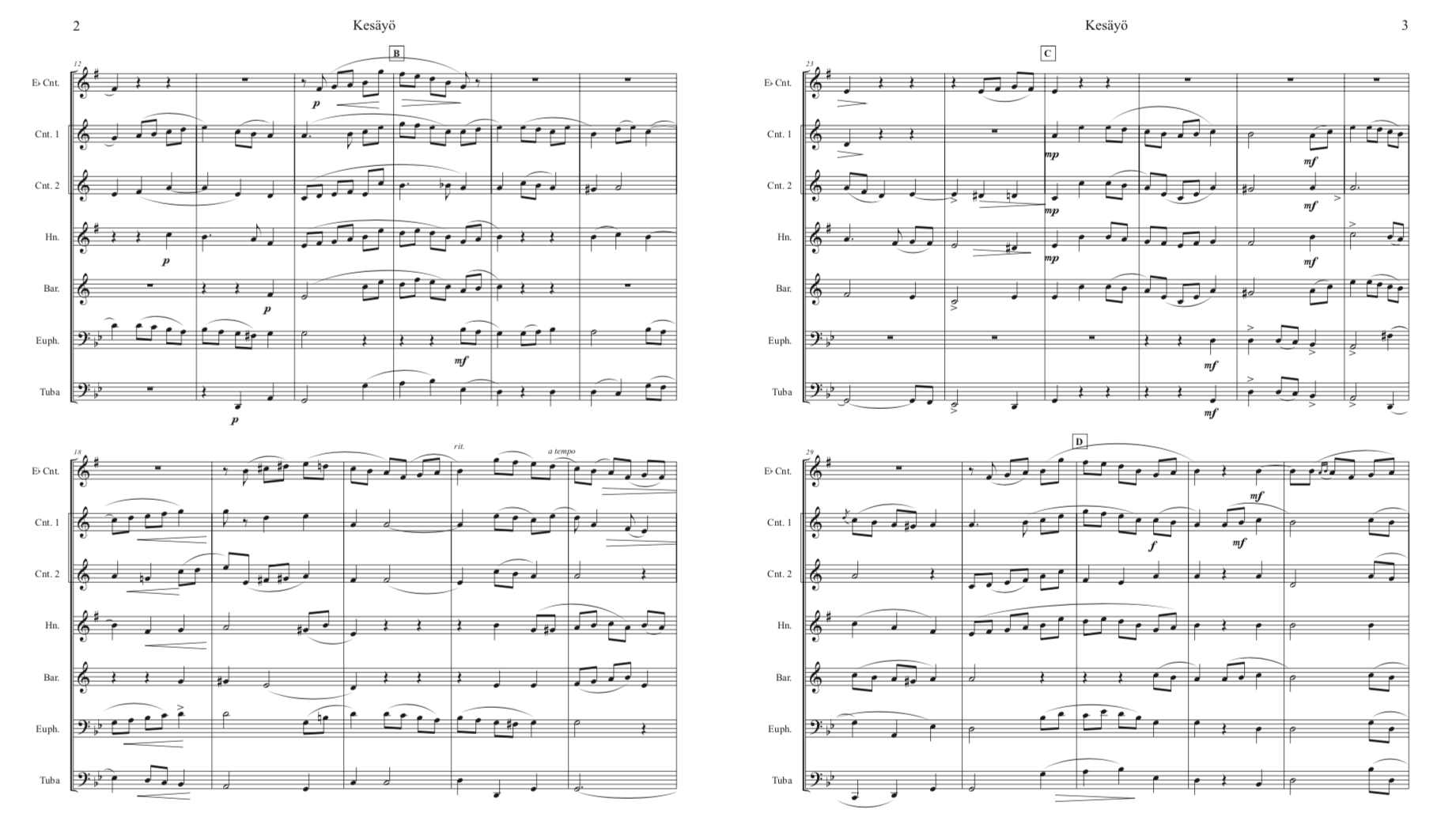 All titles have been edited to contain the following parts: Standard Finnish septet : E-flat soprano cornet, B-flat cornet I, B-flat cornet II, E-flat alto, B-flat tenor , B-flat baritone, BB-tuba (concert pitch Bass Clef). Our wish is that brass players will try the conical brass instrumentation, but also welcome playing by mixed wind bands.