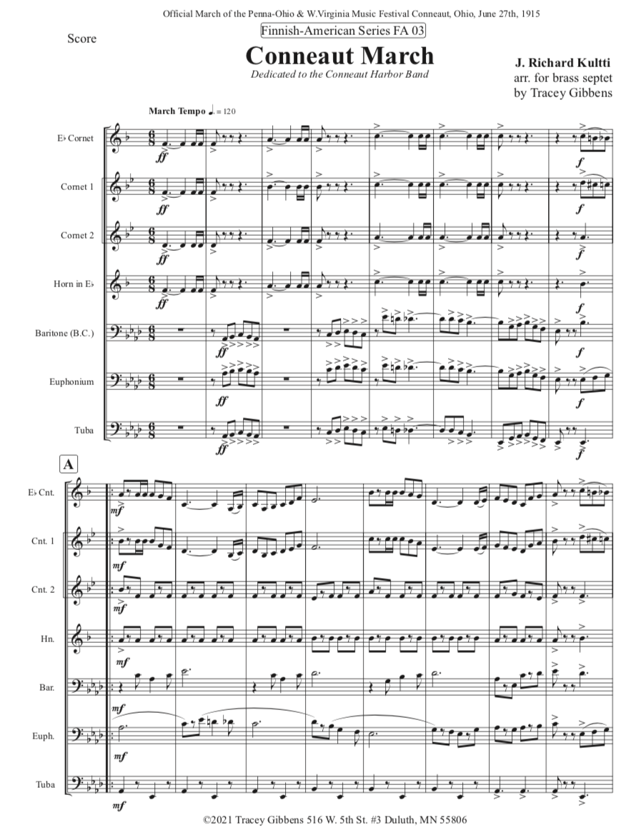 The Finnish Brass in America Series is scored primarily for original Finnish brass septet: E flat Soprano Cornet, two B flat Cornets, an E flat Alto Horn, a B flat Tenor Horn, and Euphonium, and a Tuba. However, these sets also include alternate parts for flute (piccolo), clarinet, French horn, and tenor saxophone. The original seven parts can also be played by other instrumentalists who read those clefs and transpositions (tenor saxophone, bassoon, bass clarinet, etc.) While many of us in Ameriikan poijat have contributed arrangements to this series, it has been primarily of work of Tracey Gibbens, with editing by Russell Pesola and Paul Niemisto.