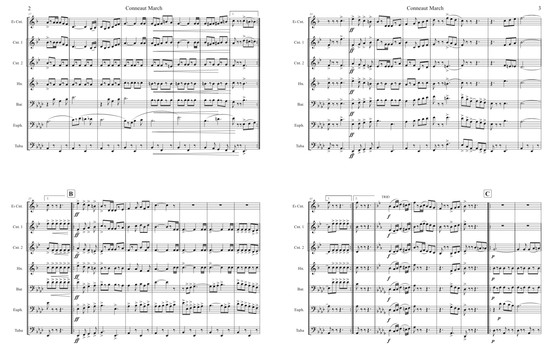 Standard Finnish septet : E-flat soprano cornet, B-flat cornet I, B-flat cornet II, E-flat alto, B-flat tenor , B-flat baritone, BB-tuba (concert pitch Bass Clef). Our wish is that brass players will try the conical brass instrumentation, but also welcome playing by mixed wind bands.