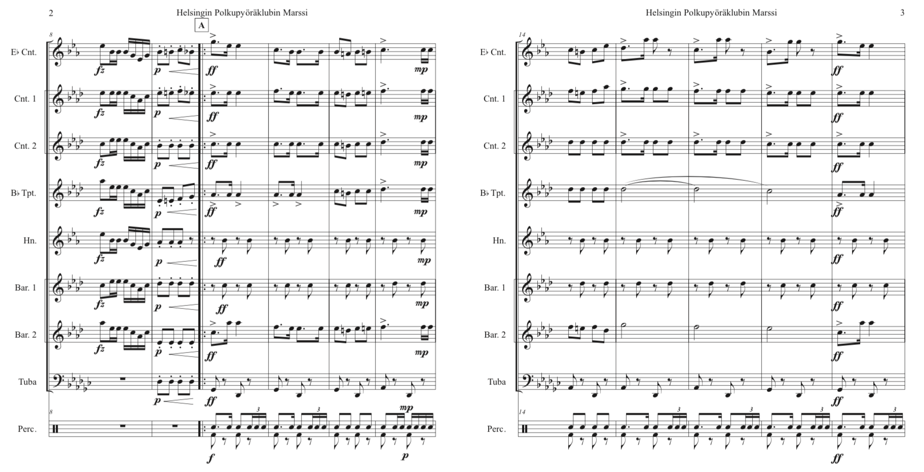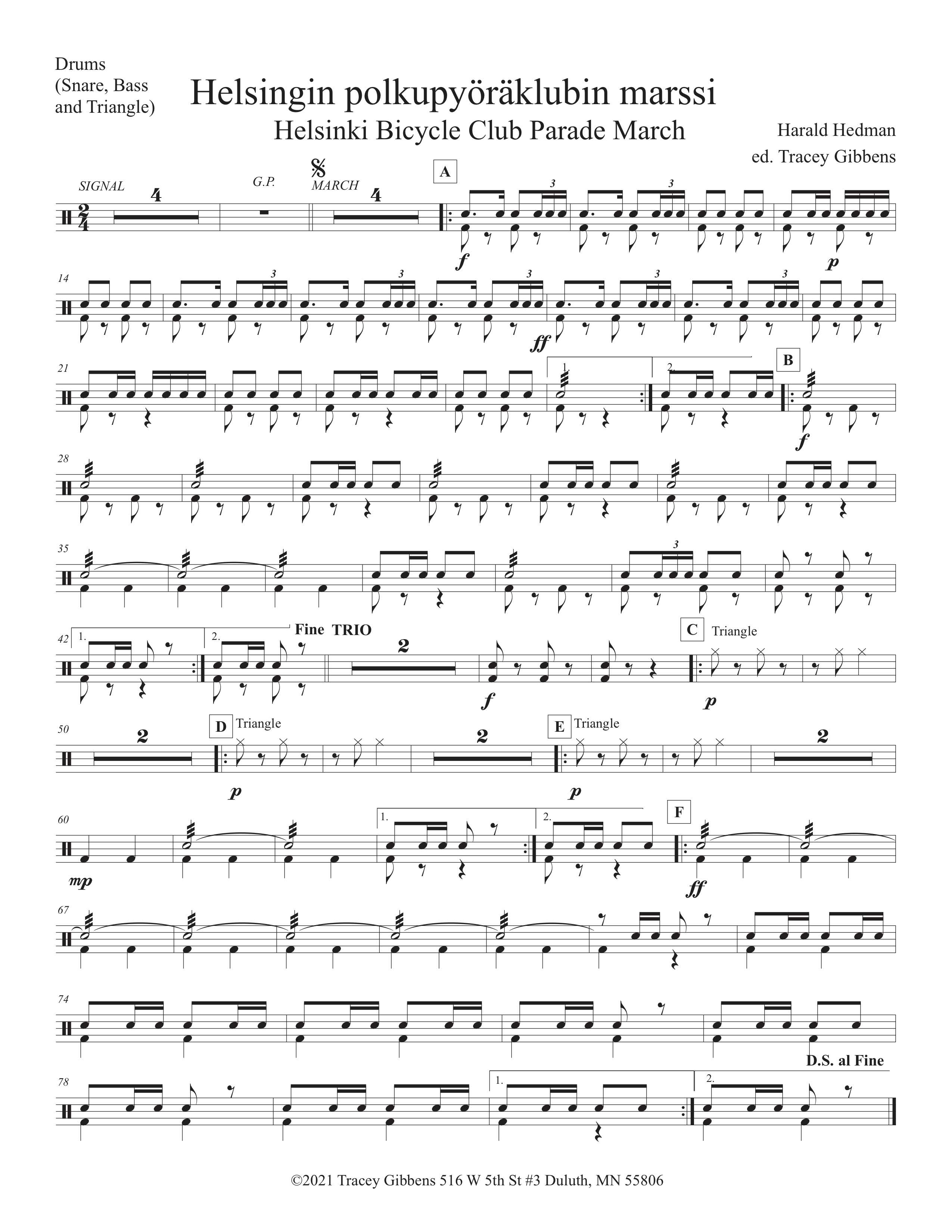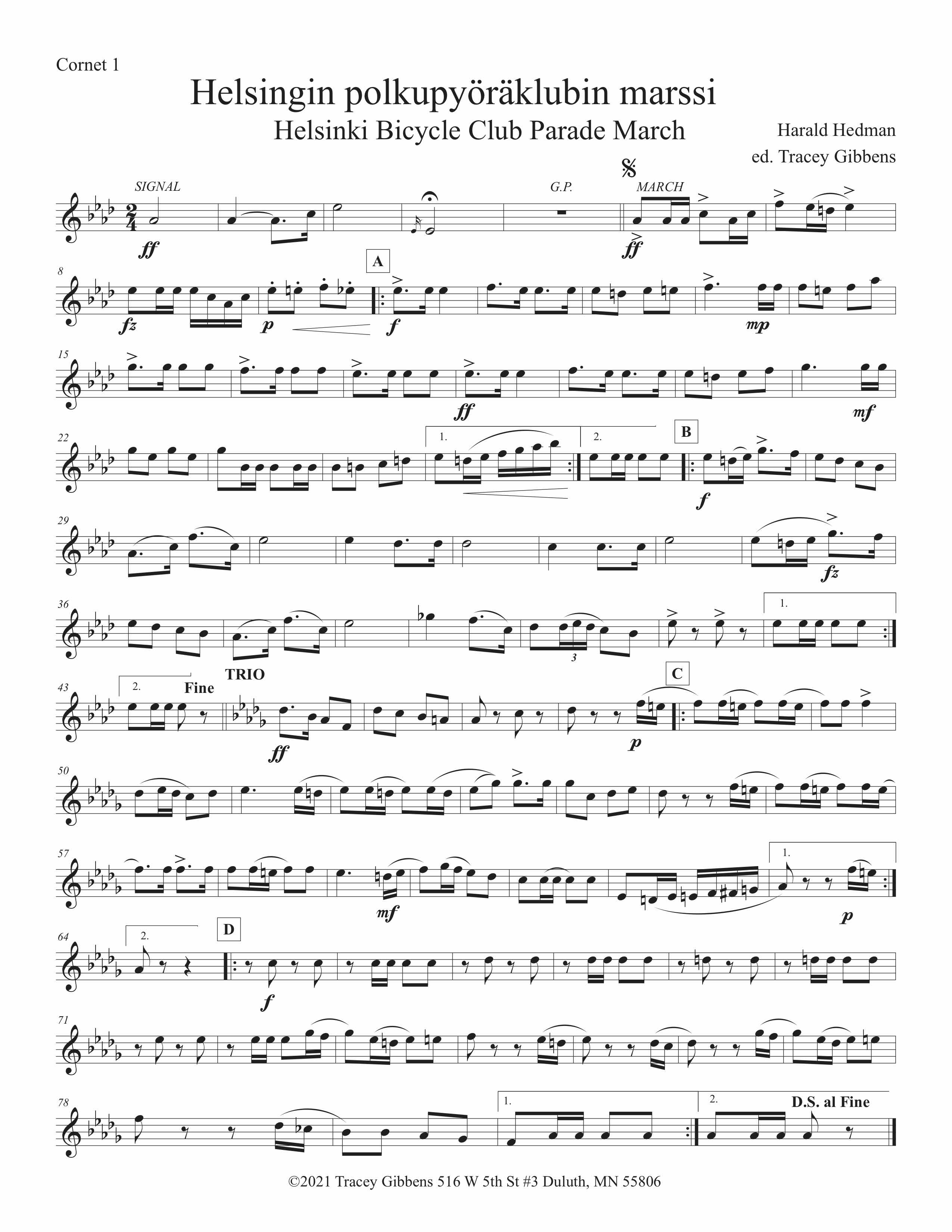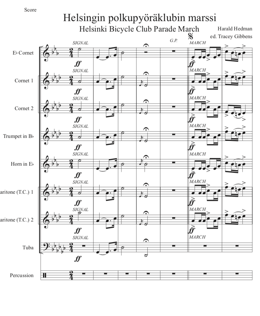 Helsingin polkupyöräklubin marssi/The Helsingfors Welociped Klubbs Marsch (Helsinki Bicycle Club March -1897) by Harald Hedman, was performed during bicycle club events in Helsinki summers, when bicycling was very popular around 1900 and later. It was found in the archives of the Helsinki Brass Band (Helsingin torvisoittokunta) led by Alexei Apostol.