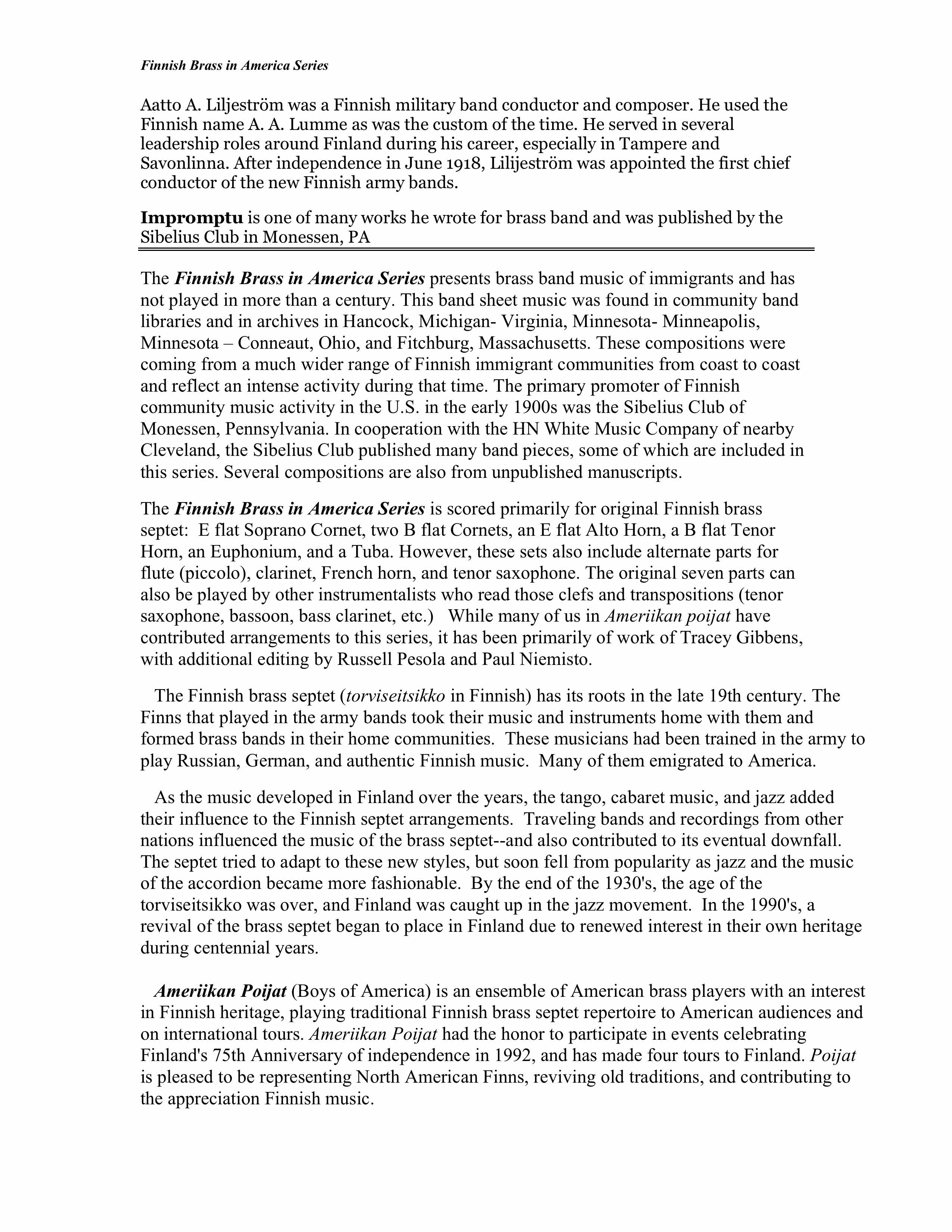 The Finnish Brass in America Series presents brass band music of immigrants and has not played in more than a century. This band sheet music was found in community band libraries and in archives in Hancock, Michigan- Virginia, Minnesota- Minneapolis, Minnesota – Conneaut, Ohio, and Fitchburg, Massachusetts. These compositions were coming from a much wider range of Finnish immigrant communities from coast to coast and reflect an intense activity during that time. The primary promoter of Finnish community music activity in the U.S. in the early 1900s was the Sibelius Club of Monessen, Pennsylvania. In cooperation with the HN White Music Company of nearby Cleveland, the Sibelius Club published many band pieces, some of which are included in this series. Several compositions are also from unpublished manuscripts.
