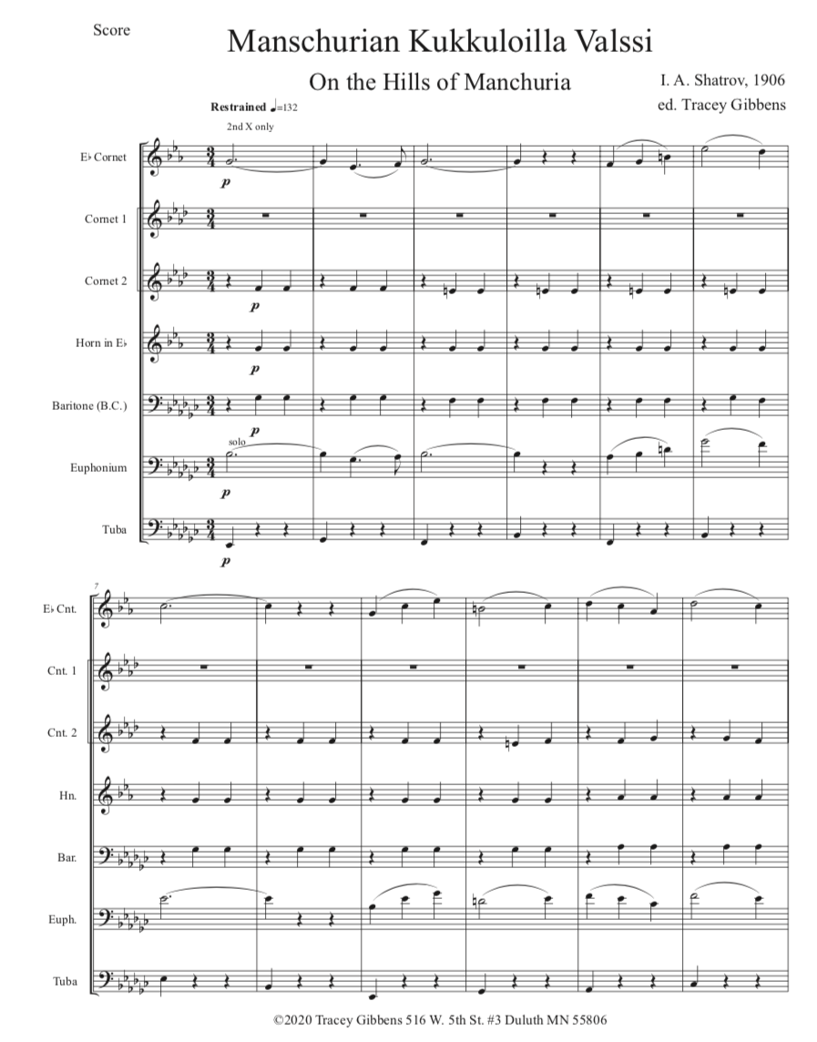 The Finnish Brass in America Series is scored primarily for original Finnish brass septet: E flat Soprano Cornet, two B flat Cornets, an E flat Alto Horn, a B flat Tenor Horn, and Euphonium, and a Tuba. However, these sets also include alternate parts for flute (piccolo), clarinet, French horn, and tenor saxophone. The original seven parts can also be played by other instrumentalists who read those clefs and transpositions (tenor saxophone, bassoon, bass clarinet, etc.) While many of us in Ameriikan poijat have contributed arrangements to this series, it has been primarily of work of Tracey Gibbens, with editing by Russell Pesola and Paul Niemisto.