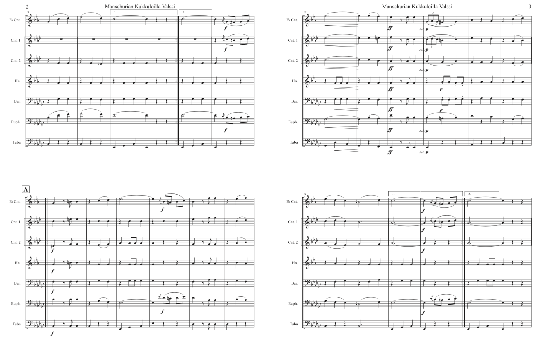 Standard Finnish septet : E-flat soprano cornet, B-flat cornet I, B-flat cornet II, E-flat alto, B-flat tenor , B-flat baritone, BB-tuba (concert pitch Bass Clef). Our wish is that brass players will try the conical brass instrumentation, but also welcome playing by mixed wind bands.