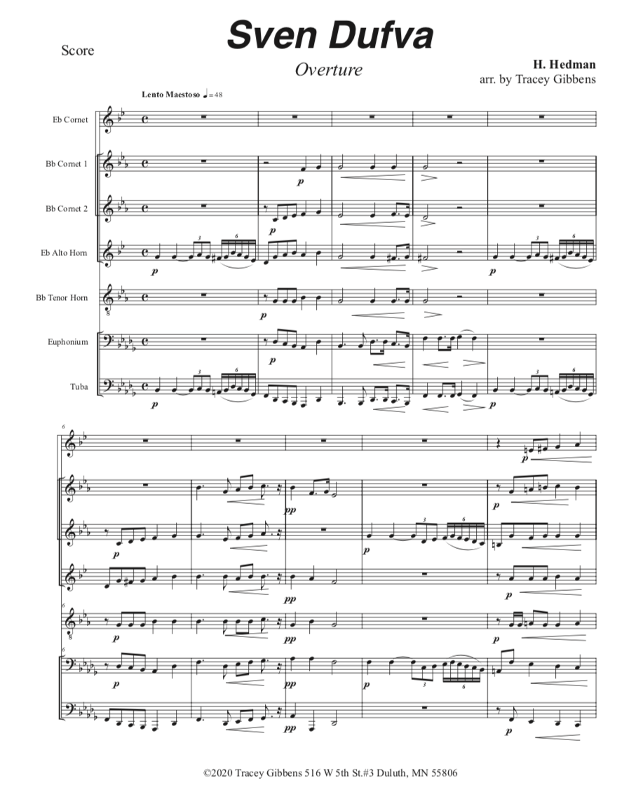 The Finnish Brass in America Series is scored primarily for original Finnish brass septet: E flat Soprano Cornet, two B flat Cornets, an E flat Alto Horn, a B flat Tenor Horn, and Euphonium, and a Tuba. However, these sets also include alternate parts for flute (piccolo), clarinet, French horn, and tenor saxophone. The original seven parts can also be played by other instrumentalists who read those clefs and transpositions (tenor saxophone, bassoon, bass clarinet, etc.) While many of us in Ameriikan poijat have contributed arrangements to this series, it has been primarily of work of Tracey Gibbens, with editing by Russell Pesola and Paul Niemisto.