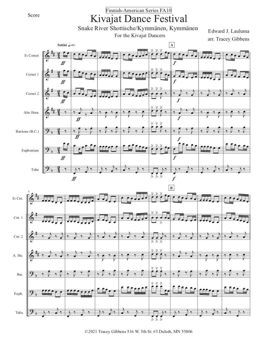 The Finnish Brass in America Series is scored primarily for original Finnish brass septet: E flat Soprano Cornet, two B flat Cornets, an E flat Alto Horn, a B flat Tenor Horn, and Euphonium, and a Tuba. However, these sets also include alternate parts for flute (piccolo), clarinet, French horn, and tenor saxophone. The original seven parts can also be played by other instrumentalists who read those clefs and transpositions (tenor saxophone, bassoon, bass clarinet, etc.) While many of us in Ameriikan poijat have contributed arrangements to this series, it has been primarily of work of Tracey Gibbens, with editing by Russell Pesola and Paul Niemisto.