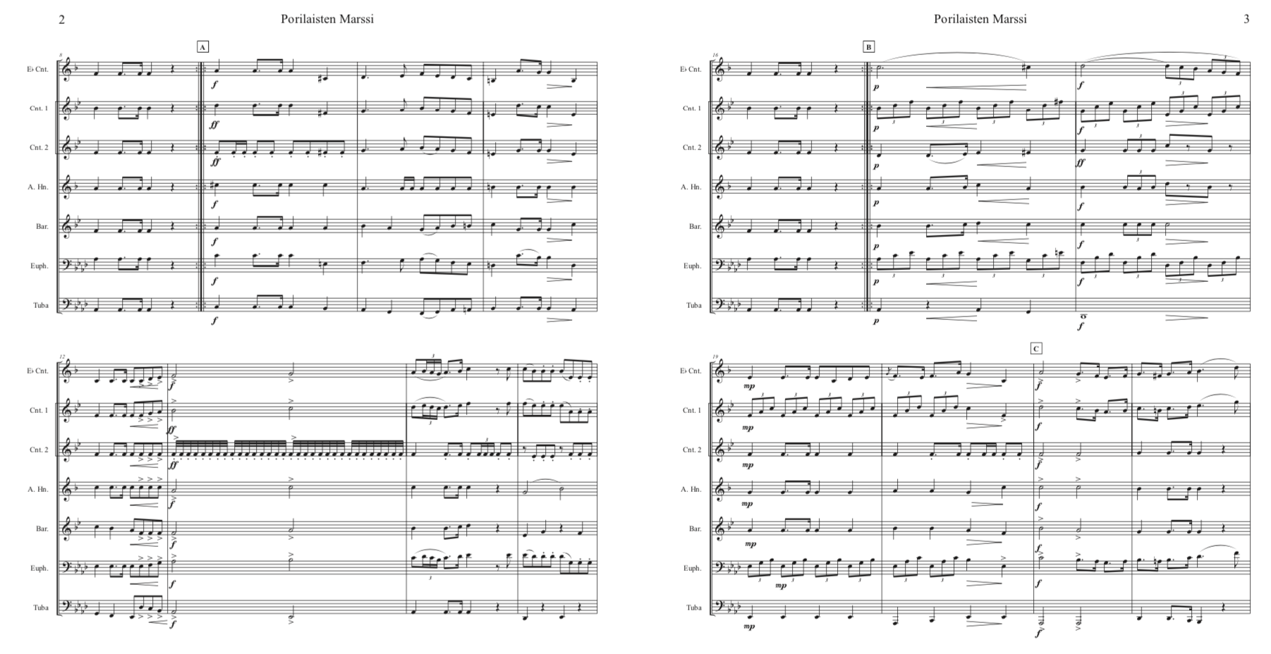 • Standard Finnish septet : E-flat soprano cornet, B-flat cornet I, B-flat cornet II, E-flat alto, B-flat tenor , B-flat baritone, BB-tuba (concert pitch Bass Clef). Our wish is that brass players will try the conical brass instrumentation, but also welcome playing by mixed wind bands.