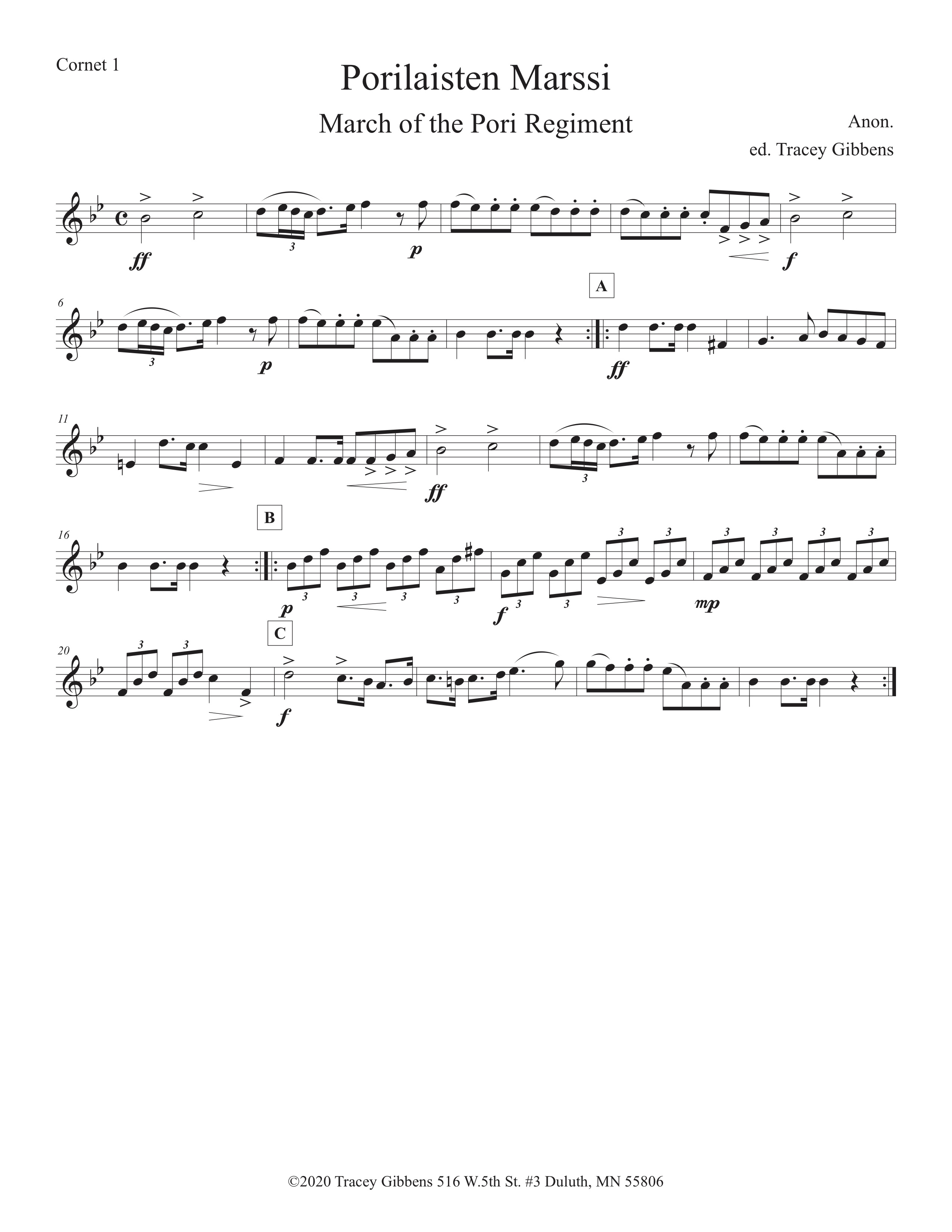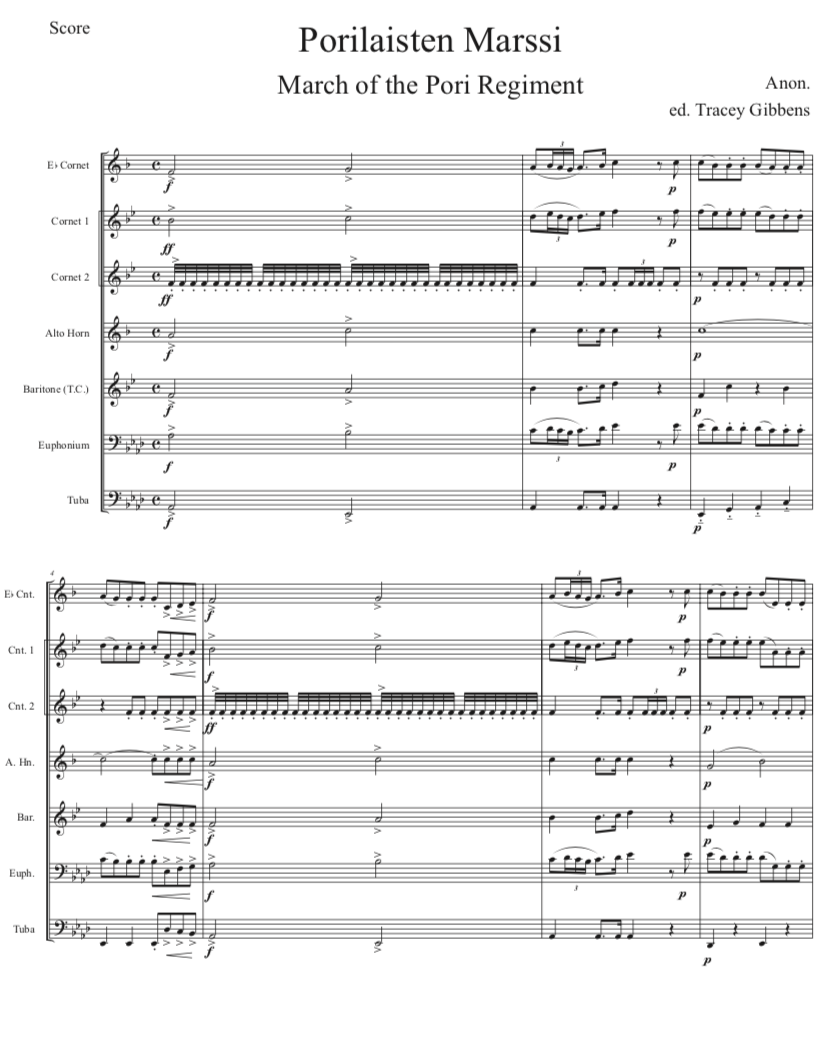 The Ameriikan poijat Finnish Classics Series presents brass band music of the era around Finnish independence, which has largely not played in more than a century. Manuscripts of his band music was found in national archives, libraries, and community band libraries from around Finland, especially Turku, Pori, Oulainen, Tampere, Mänttä, and Helsinki.. These compositions were coming from a wide range of Finnish cultural organizations from coast to coast and reflect an intense activity during that time. The primary promoters of Finnish community music activity were the Kansanvalistuusseura and the Työväen musiikkiliito, and several other groups. A main source for this repertoire is the military music archives. The scores were often published and then parts were drawn out by the local performing musicians by hand manuscript. The Ameriikan poijat Finnish Classics Series is scored primarily for original Finnish brass septet: E flat Soprano Cornet, two B flat Cornets, an E flat Alto Horn, a B flat Tenor Horn, an Euphonium, and a Tuba. However, these sets also include alternate parts for flute (piccolo), clarinet, French horn, and tenor saxophone. The original seven parts can also be played by other instrumentalists who read those clefs and transpositions (tenor saxophone, bassoon, bass clarinet, etc.) While many of us in Ameriikan poijat have contributed arrangements to this series, it has been primarily of work of Tracey Gibbens, with editing by Russell Pesola and Paul Niemisto.