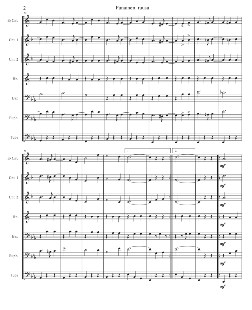 • Standard Finnish septet : E-flat soprano cornet, B-flat cornet I, B-flat cornet II, E-flat alto, B-flat tenor , B-flat baritone, BB-tuba (concert pitch Bass Clef). Our wish is that brass players will try the conical brass instrumentation, but also welcome playing by mixed wind bands.