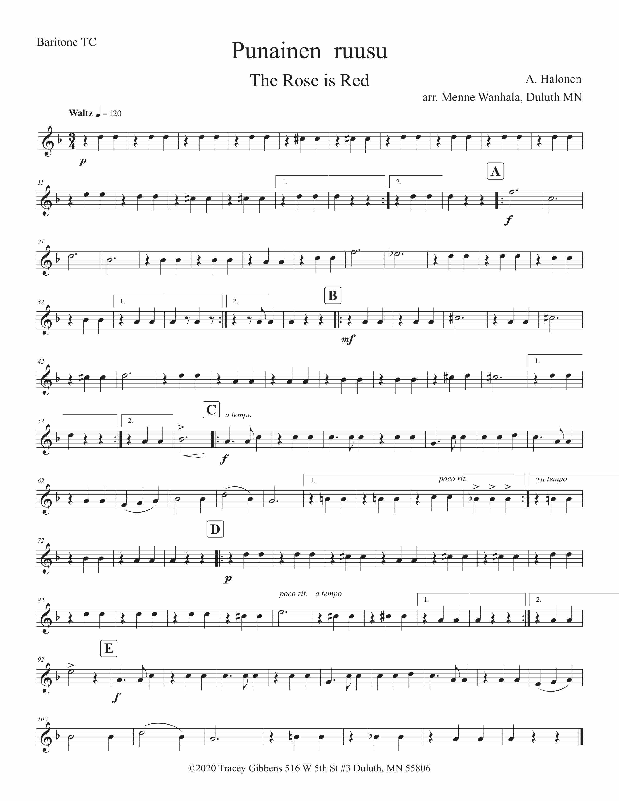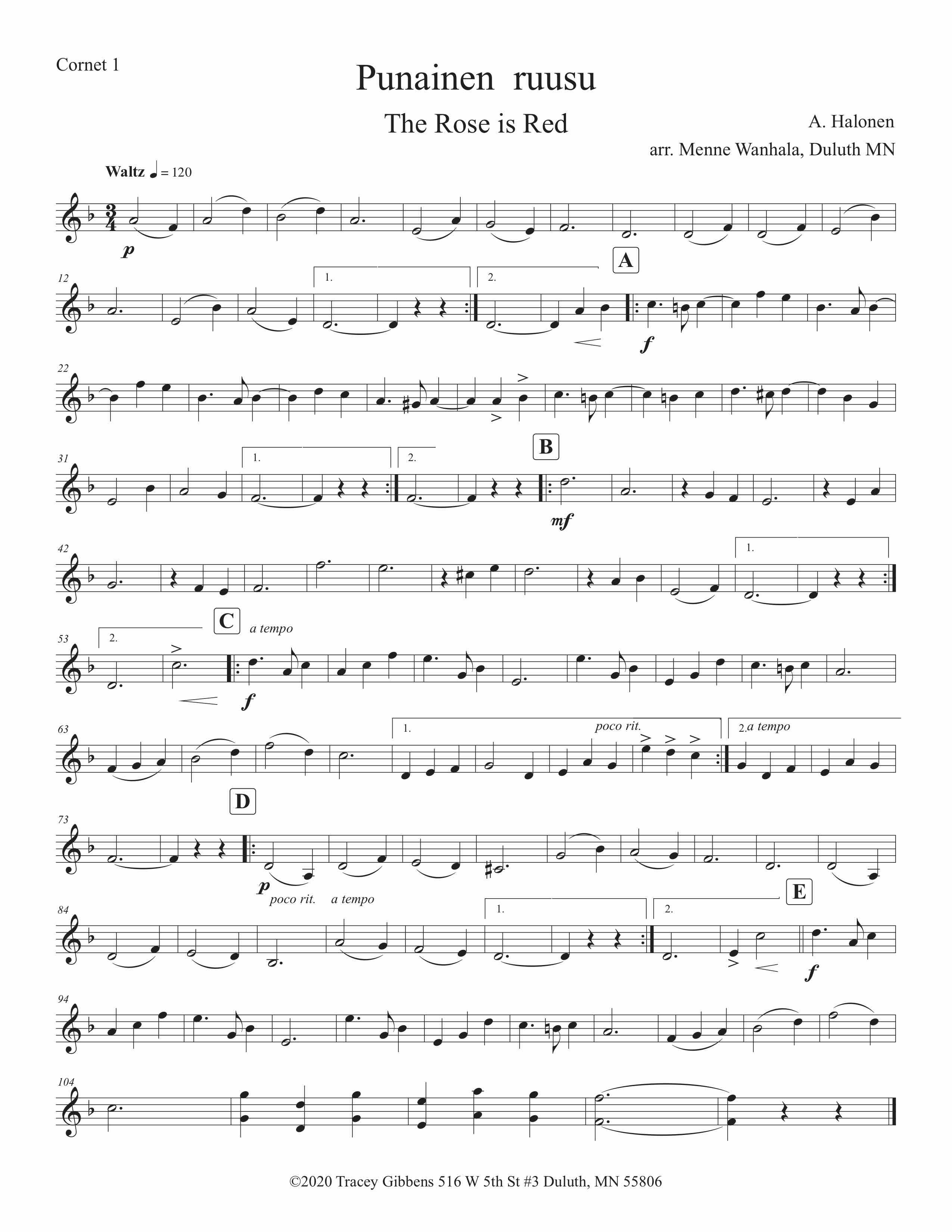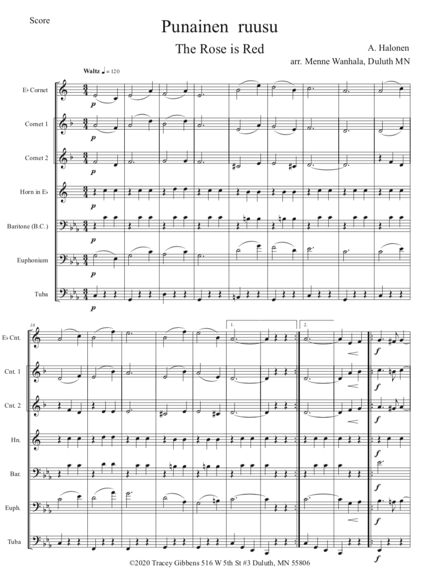 Punainen ruusu (Red Rose) is a waltz thought to be written by A. Halonen for the Duluth Finnish Workers’ Band. Menne Wanhala, the band’s leader is the probable arranger. The material was found at the Accordion Museum in Superior, Wisconsin. Nothing has been found about Halonen’s life story. The band music collection at the Accordion Museum is all from Menne Wanhala.